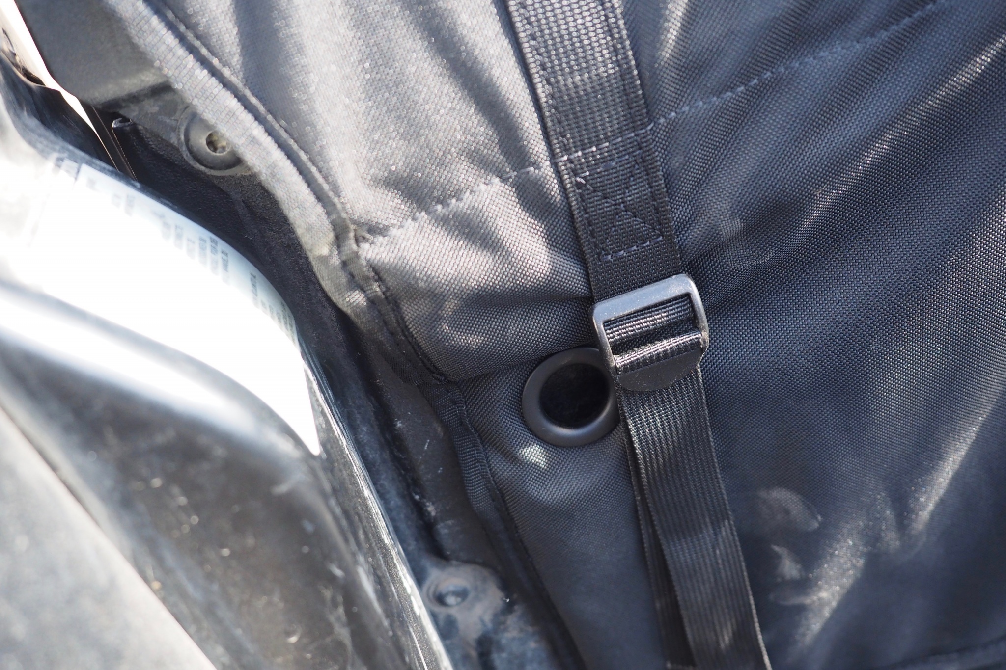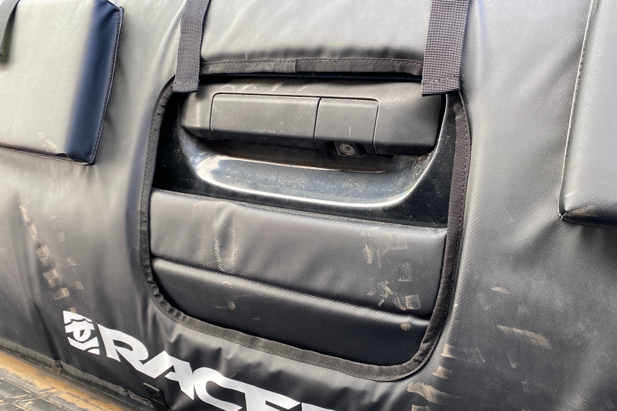 Most pads attach to the truck with webbing straps that feed under the tailgate and through a cam-locking buckle. Credit: Jeremy Benson