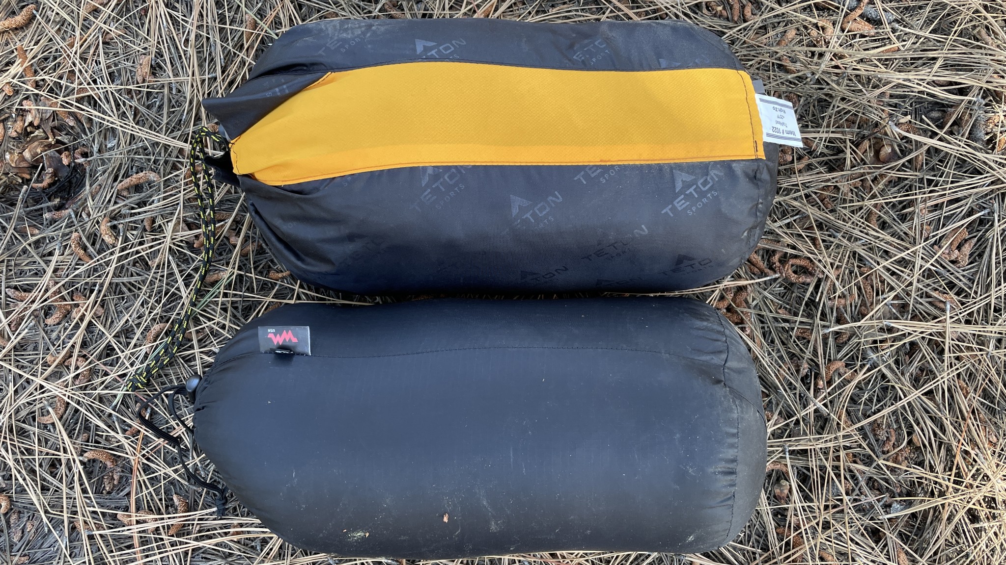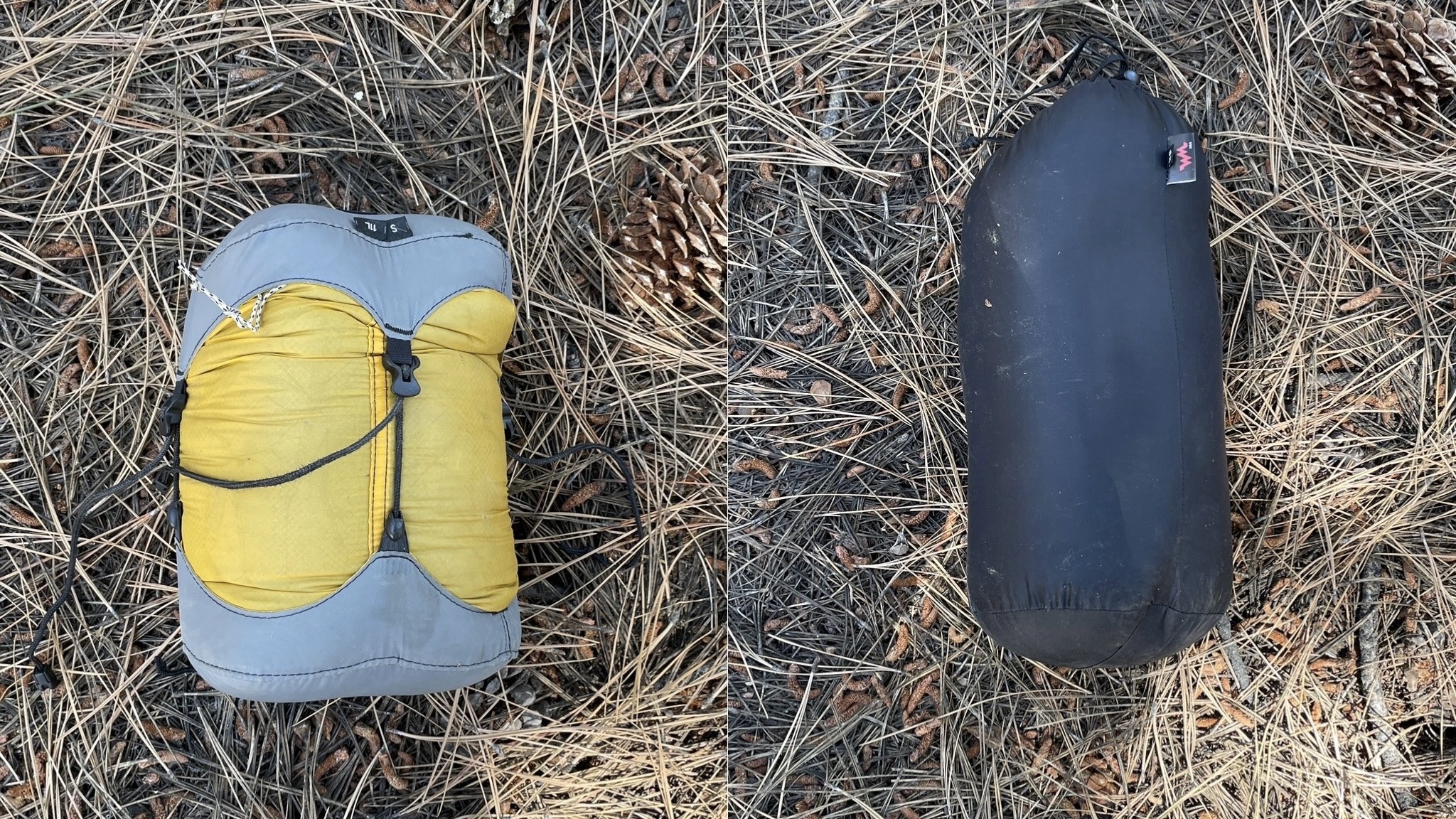 One of our warmest bags in the included stuff sack (right) and a compression sack (left).   Credit: Ian McEleney