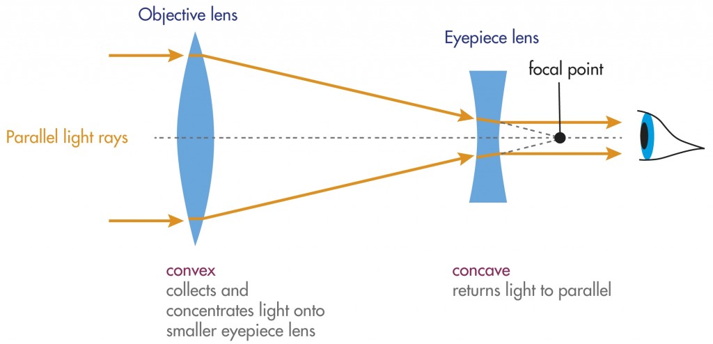 The next major advancement was Keplerian Optics which used a convex eyepiece and relay lens in between the objective lens and eyepiece to flip the image. The lengths of these binoculars and telescopes were quite large to account for the long focal length.
