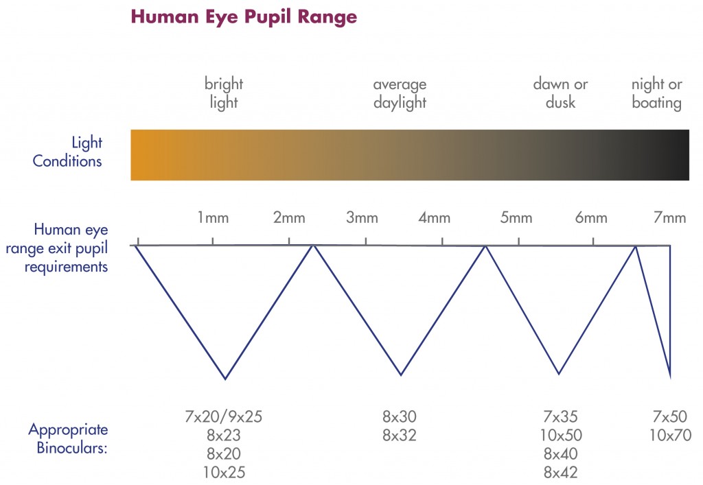 If your eye's pupil is dilated to 3mm and your binoculars' exit pupil is 3.125mm, this could make it hard to use on a pitching boat or to see a fast-moving animal. A larger exit pupil can also help provide eye relief and help people with eyeglasses. Just remember the exit pupil is not a measure of brightness. The quality of the optics can affect brightness more than the exit pupil.