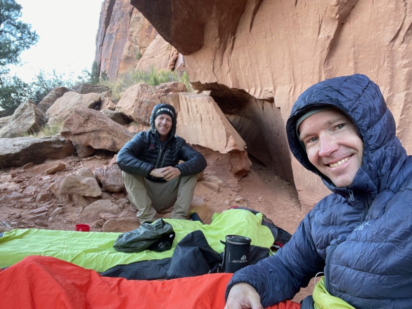 Waking up warm and dry on an exposed bivy ledge in Zion National Park.