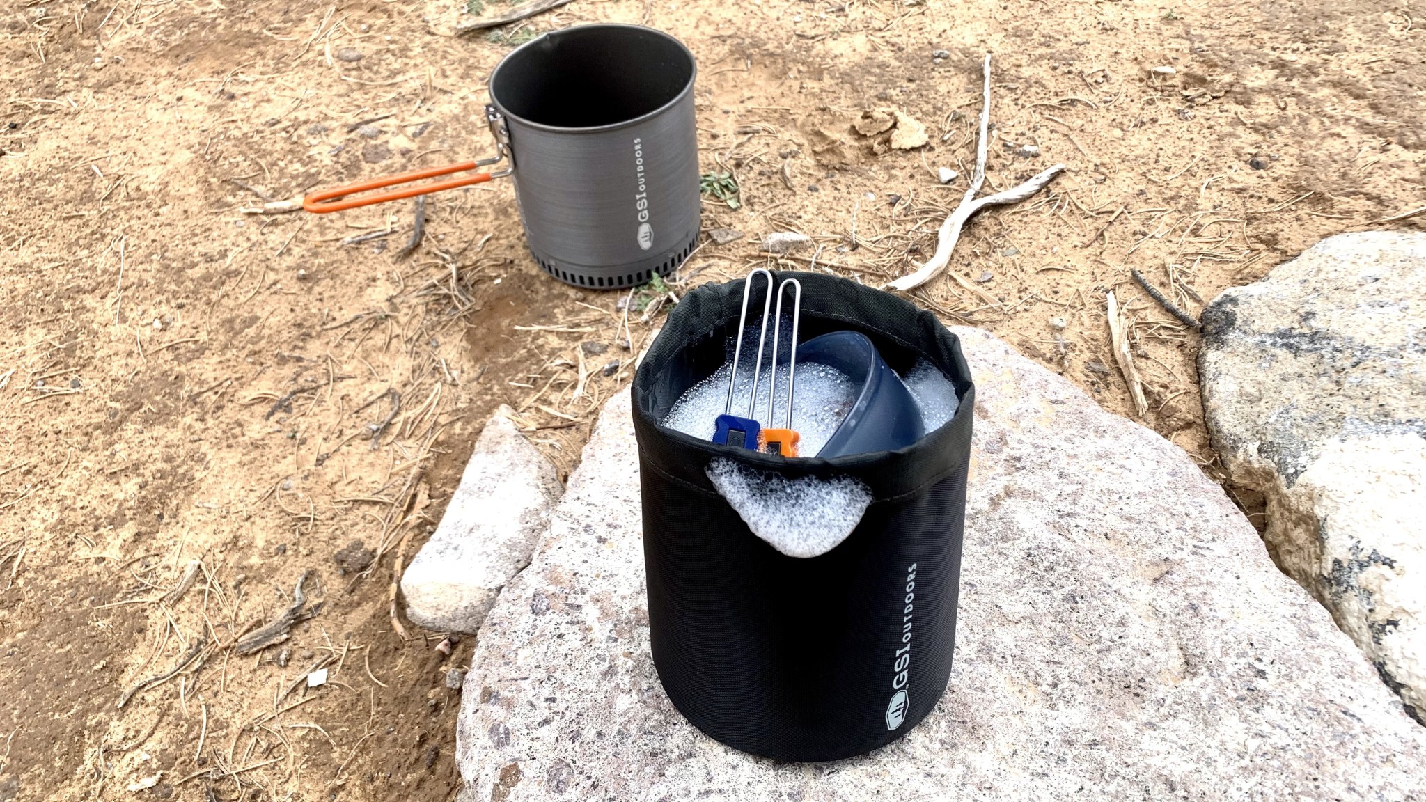 If you're shopping for a cookware set to take on your camping adventures, it's hard to top the GSI Outdoors Pinnacle Dualist HS. During our water boiling time tests, the included pot was one of the fastest to reach a boil that we've seen. The combination of a heat-exchanger ring at the bottom and hard-anodized aluminum construction speeds up cooking time, which also helps conserve valuable fuel. The set includes a lid that doubles as a strainer, two folding sporks, two insulated mugs, and two bowls. “I love that the storage sack doubles as a sink — what a cool feature. It's not shaped like a sink, necessarily, but it holds water, and you can use it to wash dishes,” remarked our lead tester. Having a designated spot for scrubbing dishes is much more convenient, clean, and efficient than washing everything in the same pot you use for cooking.