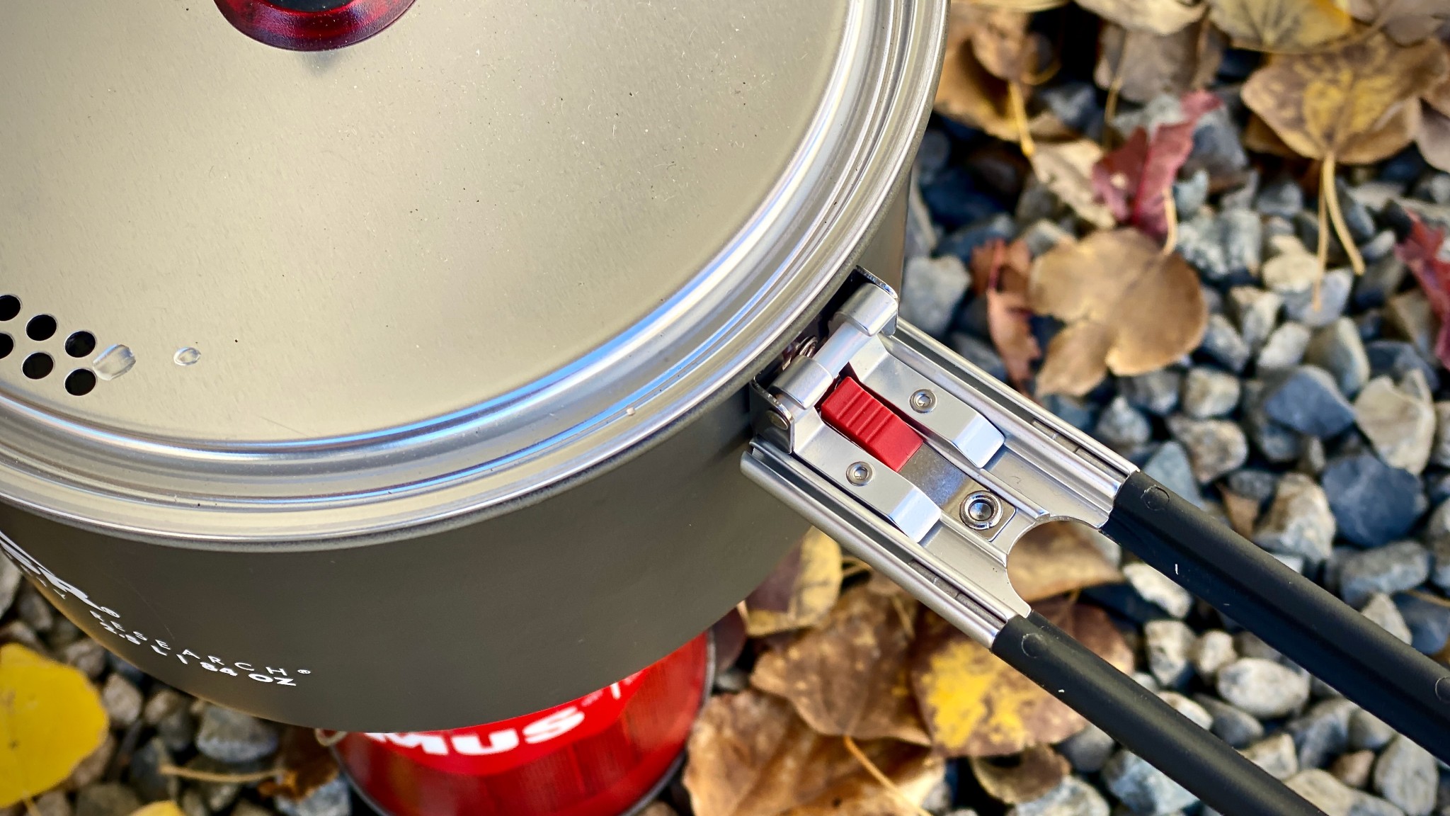 The MSR Fusion Ceramic 2-Pot Set handle is very easy to use and is shared between the two pots. It can even be easily transferred from one pot to another while cooking. Credit: Trish Matheny
