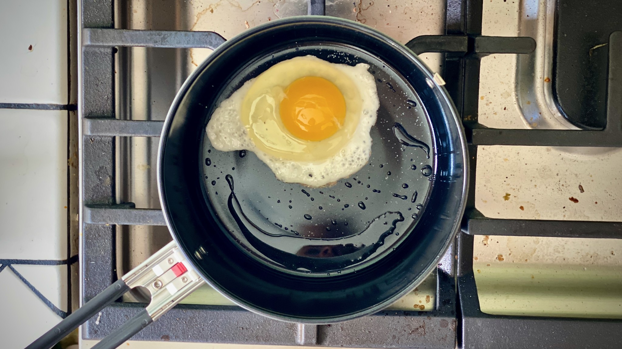Though the Snow Peak Ti-Mini Solo Combo 2.0 only features a 16 oz. mug and 30 oz. pot, we still found it easy to fry an egg on the titanium surface. Credit: Trish Matheny