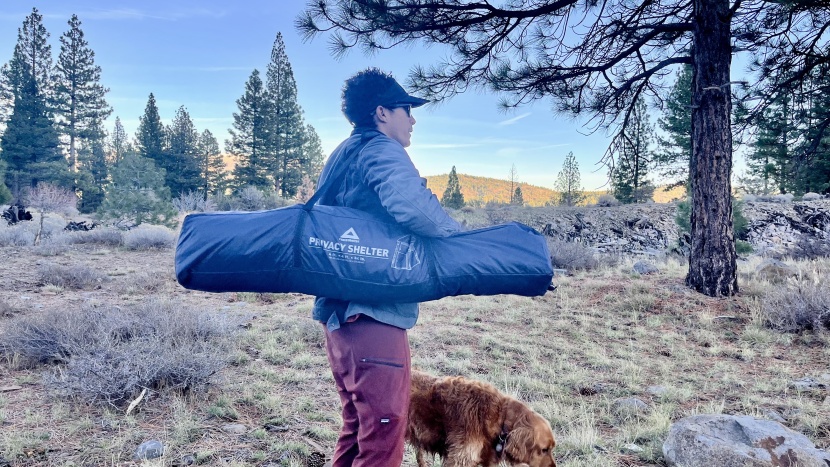 We have a couple of gripes with this shelter. For one, it's quite bulky, weighs about 15 pounds, and takes up quite a bit of car space, though that's something you'll have to get used to with any privacy shelter. Luckily, it comes with a carrying case that has a decent handle for lugging it around—though it's not the most comfortable to carry. And, while the setup was quick and easy, the takedown was a bit of an ordeal, but we eventually got the hang of it. Finally, while we were able to get the Nemo Helio to hang in this unit, it took some troubleshooting. Nemo specifically recommends its Heliopolis shower tent for the Helio shower, though we haven't tested it out just yet.