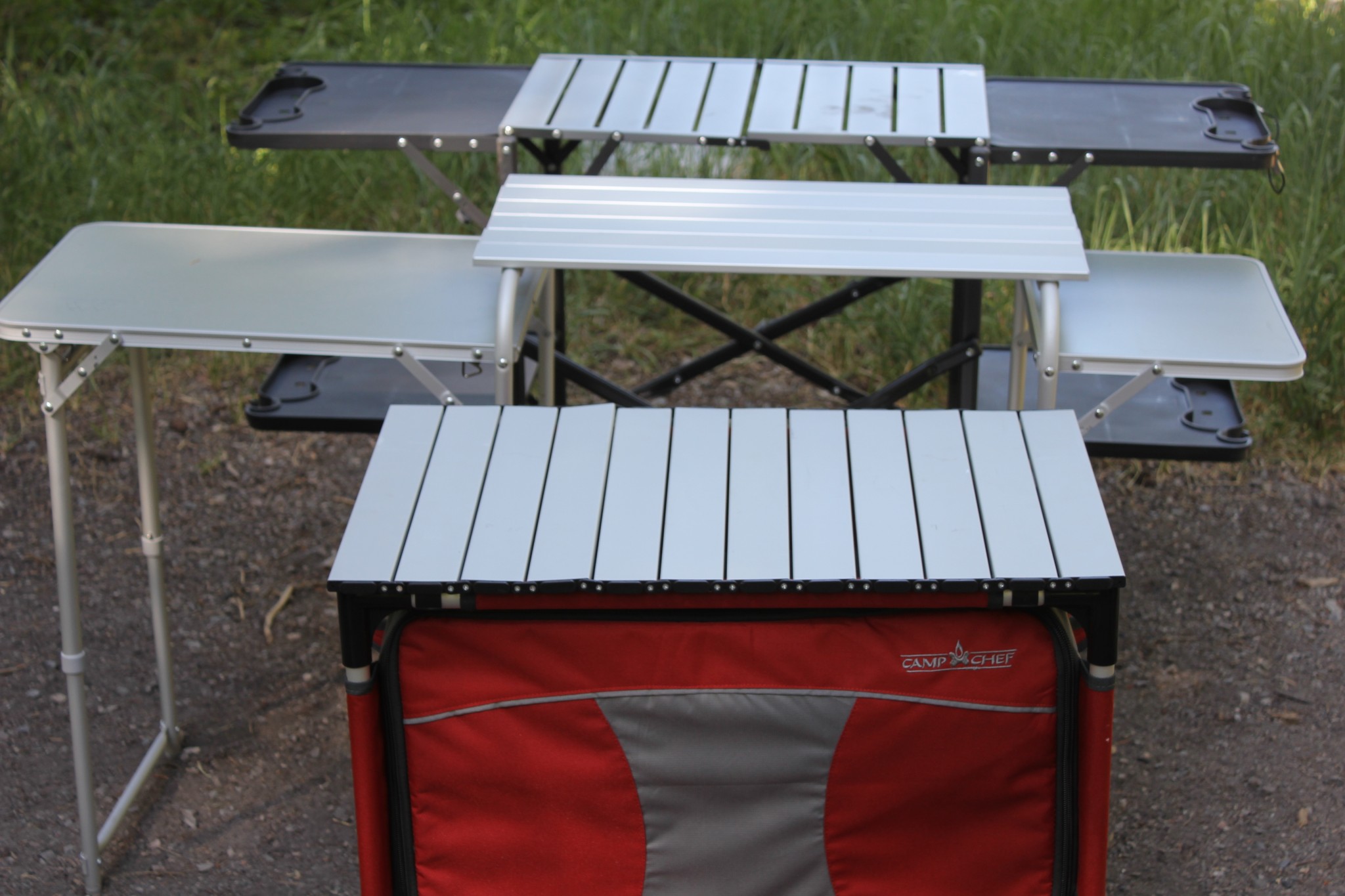 These are traditionally more complicated, bigger, heavier, and are designed for preparing and cooking grub, as well as providing organization for your camp kitchen needs. They also provide the most storage for cookware and other items you might want handy. The Camp Chef Sherpa is our favorite example of this type of table. Here are some key advantages and drawbacks within this subcategory: