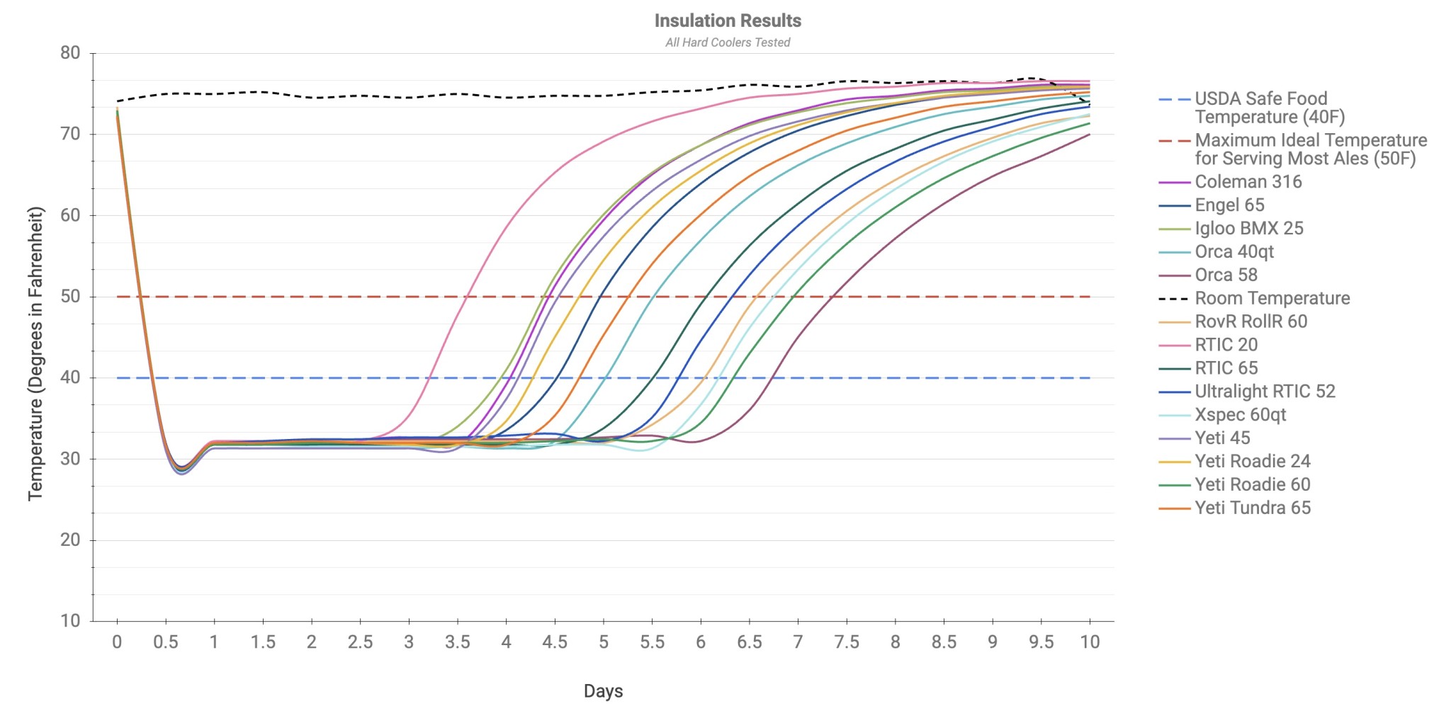 We chose 50 degrees Fahrenheit as an indicator of your average level of beverage refreshment. Depending on your choice of drink, you may enjoy it slightly warmer (like wine) or slightly colder (lighter beers) than 50º. As different types of beers have different recommended serving temperatures, we used 50º as an average. Knowing how long you can expect chilled refreshments to stay chilled before they become hot drinks can make all the difference during your camping trip, family reunion, or backyard party.