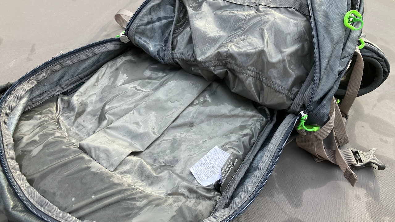 The very soggy interior of the Osprey Sportlite after our one-minute hose test. All zippers were closed for this test, and our sprayer was set to the “garden” setting to mimic a steady rain. Credit: Tara Reddinger-Adams