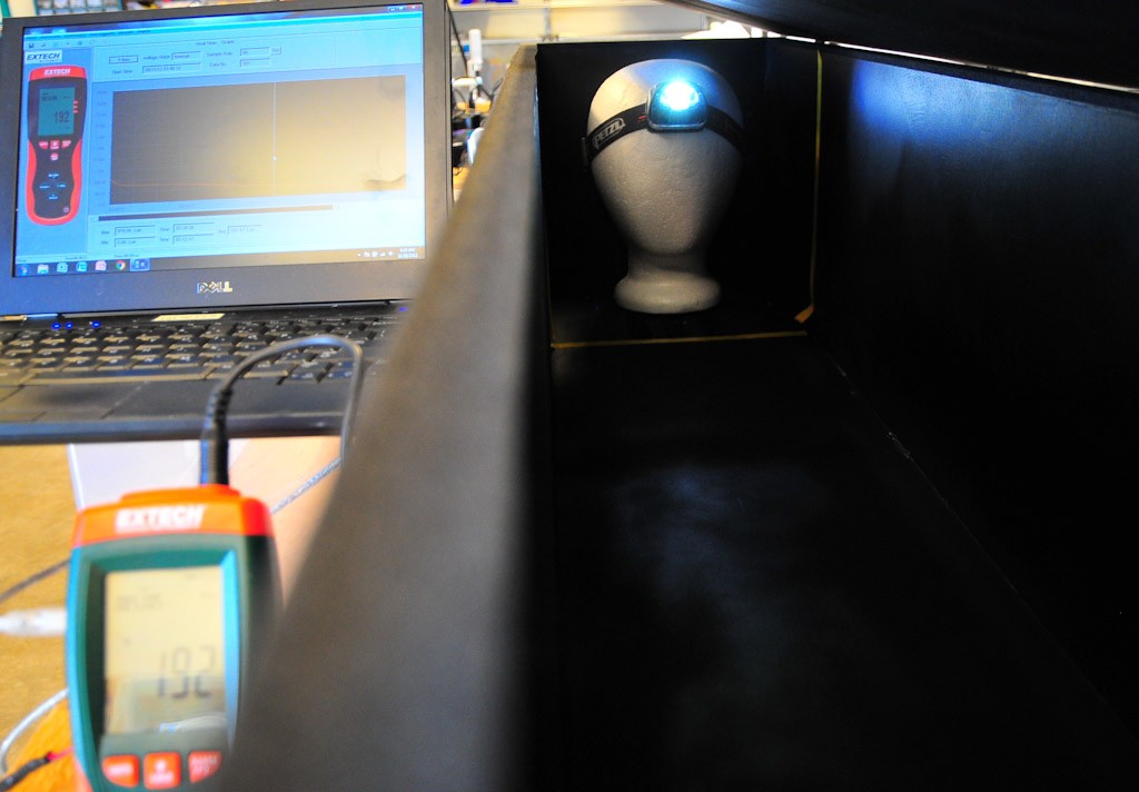 To measure battery run-time, we built a light-proof box we call the OutdoorGearLab Light Coffin which is instrumented with a data logging light meter. Each headlamp is placed at a fixed distance from the light meter, which is in turn connected to a laptop to record data. Fresh batteries are used for every test. We close the box and begin measurement one minute after the light is turned on. This setup allows us to measure brightness once a minute and see how performance degrades as batteries drain. Using similar math as described above, we convert the recorded data into a graph of beam distance over time (see below).