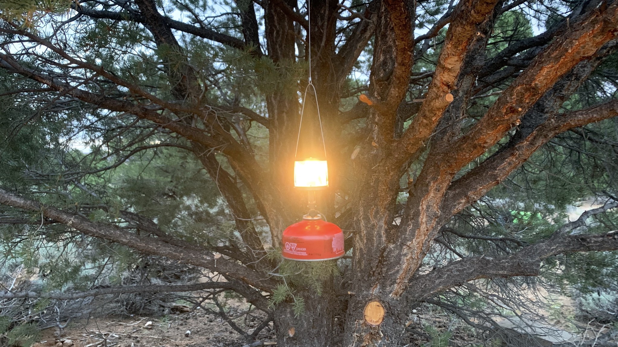 The Primus Micron's steel cable provides ample room between the open flame and whatever you choose to hang it from. Credit: Ross Patton