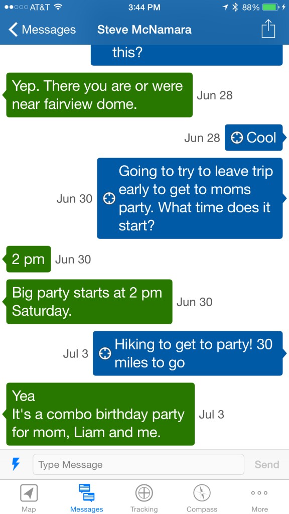 Tracking is essentially an automated “OK message” sent after initial activation, without your participation, and on some predetermined interval. Tracking data is sent to contacts you identify or to a web interface you can share in various ways. Loved ones at home sometimes enjoy “watching” your progress. Satellite messenger live tracking is fast becoming a standard way of verifying speed records and “fastest known times.” Not all satellite messaging services and products offer live tracking. OK messages and tracking don't give any customized or qualitative information about your progress or status.
