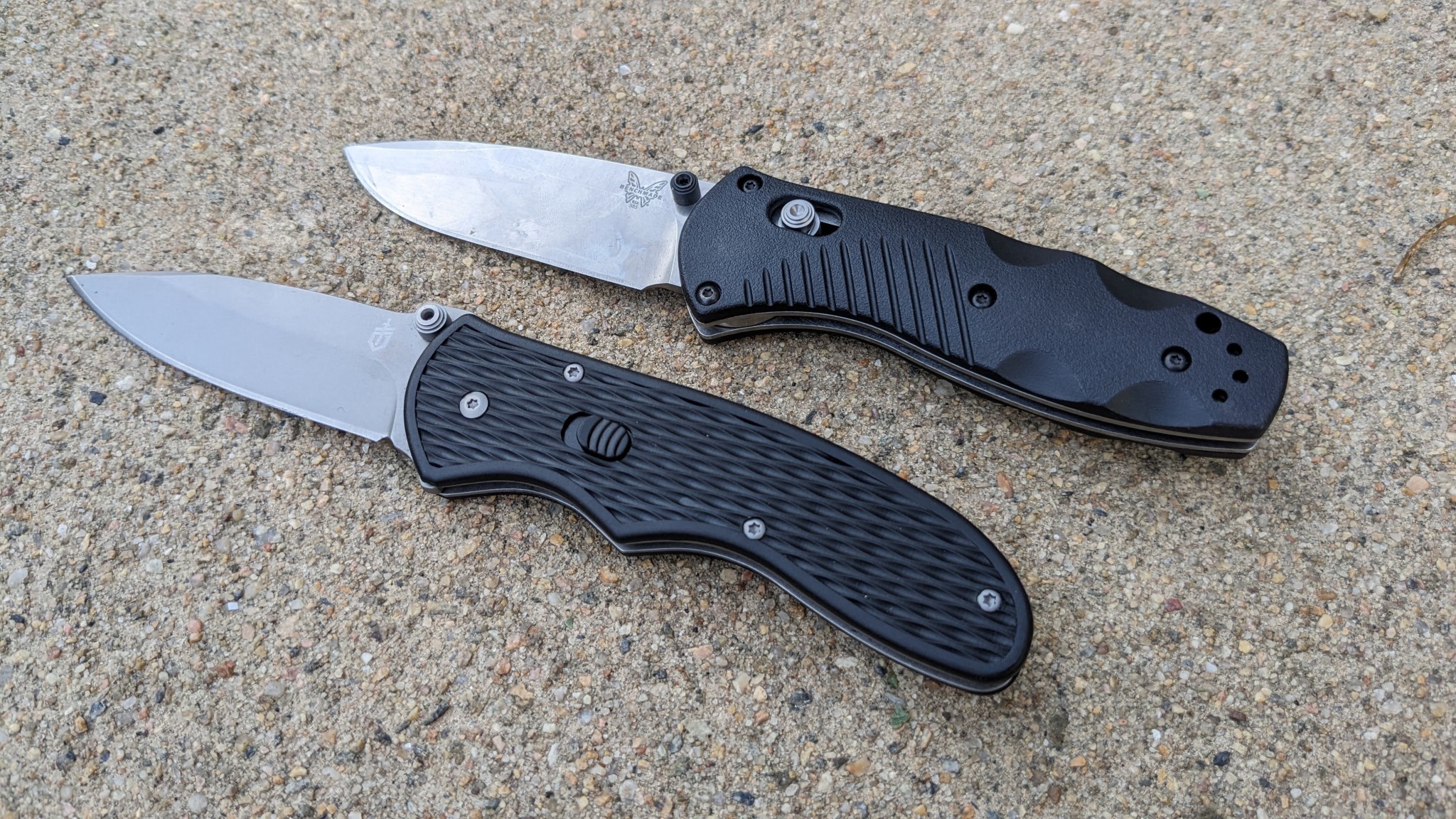 Side-by-side of the Benchmade Mini Barrage and the Gerber Fast Draw. The similarities abound between these two knives: similar resin handle scales, lock upgrades over a standard liner-lock, size, weight, blade style, and spring assist opening speed. The difference is in the quality of craftsmanship. Credit: Kyle Hameister