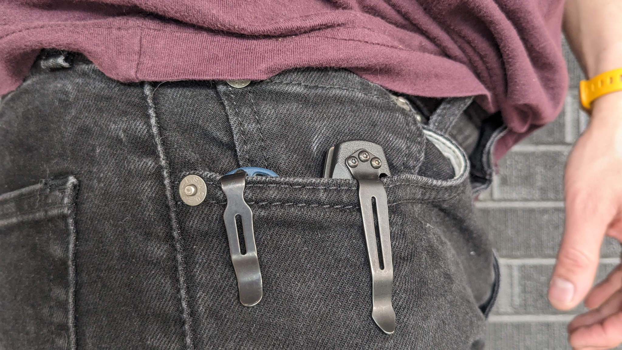 Pocket clips can make a world of difference for everyday carry. The Benchmade Mini-Barrage 585 (right) is way too strong to slip over a pocket edge easily, and sits significantly higher than the Benchmade 535 Bugout (Left). Credit: Kyle Hameister