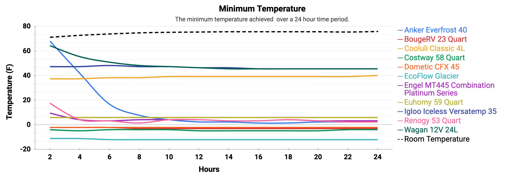 Close behind is the Euhomy 59 Quart, with a minimum temperature of 5.9°F. However, its set temperature was -4°F during this test, and its average temperature difference was 4.1°F.