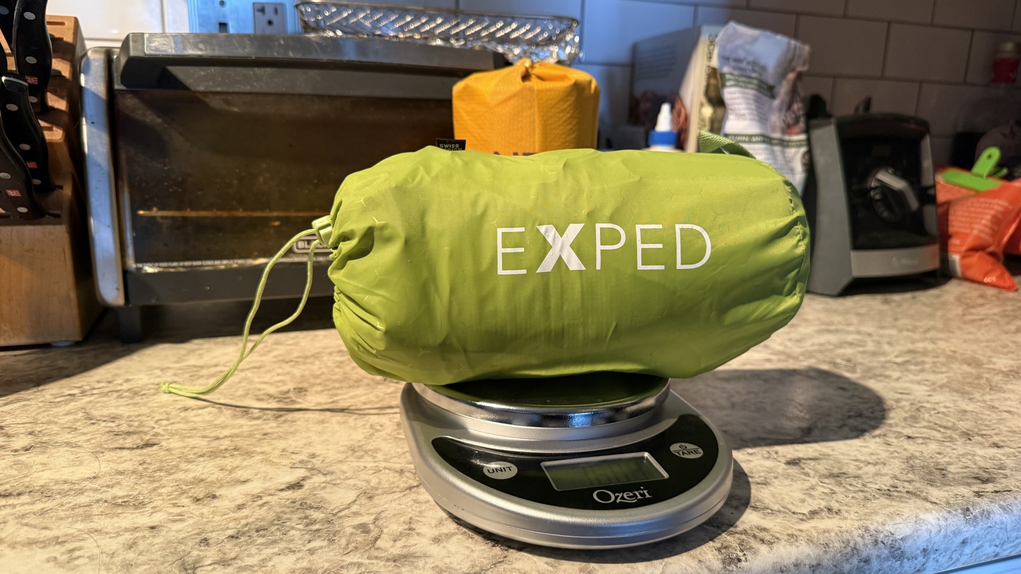 Rather than just trusting the manufacturer's specifications, we used a kitchen scale to test the actual weight of each packed pad. Credit: Emily Pennington