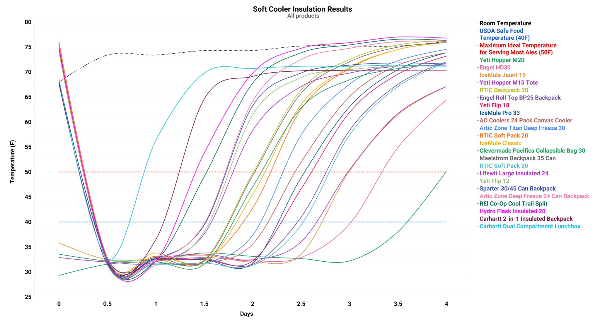 Before we started timing how long our drinks stayed cold, this review began with market research into which soft coolers are worth testing. Every year, the number of impressive-looking soft coolers grows, and we've been expanding our selection of test-worthy models since 2017. Testing consists of a quantitative ice melt test and extensive field use. The ice melt test was carried out in a controlled environment with the internal temperature of the coolers monitored and analyzed in accordance with the USDA's Refrigeration and Food Safety Guidelines. Field use occurs in various environments, from hot desert hikes to road trips from muggy Minnesota to sunny California, for a well-rounded set of conditions. All this adds up to a comprehensive review, which will thoroughly equip you to make a well-suited soft cooler purchase. See our full How We Test article for additional testing details.