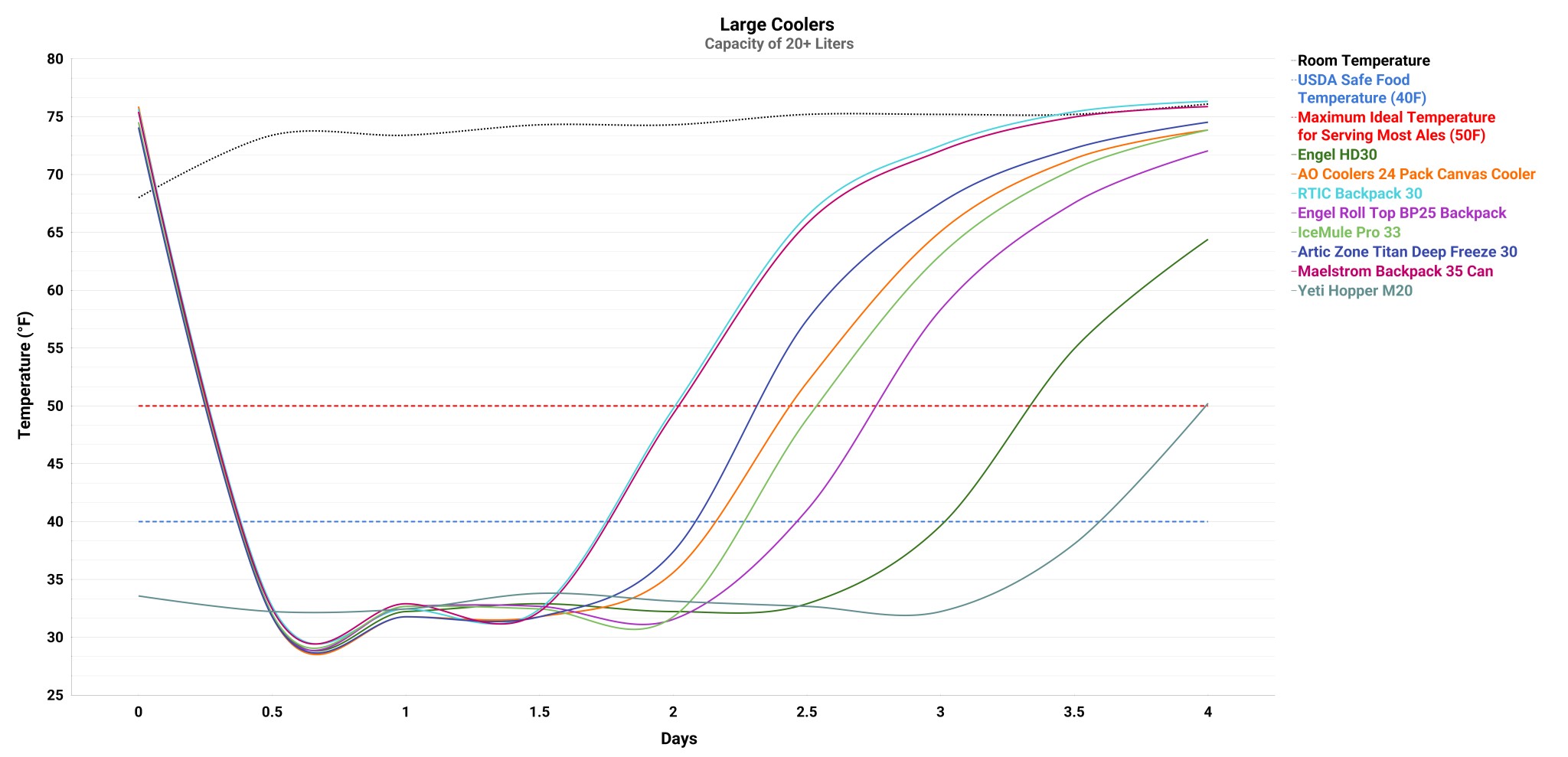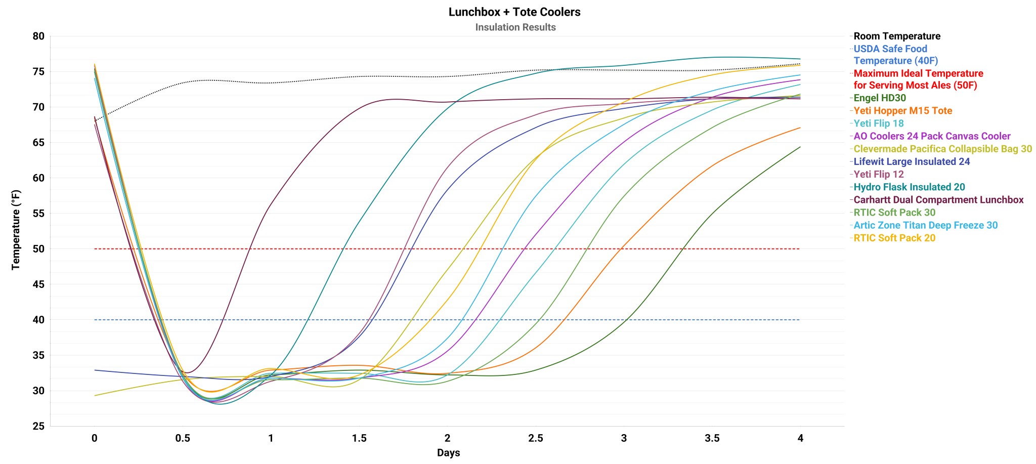 We noted two critical temperature thresholds during our testing: 40 and 50 degrees Fahrenheit. While 40 degrees is the food-safe threshold recommended by the FDA, 50 degrees represents the average ideal max temperature for serving beer. Of course, the ideal beer-drinking temperature depends on the beer you enjoy and your preference. The American Homebrewers Association provides the optimal beer serving temperatures. We chose 50 degrees as the maximum beer serving temperature and as a second benchmark temperature to easily grasp the rate of temperature increase as the ice melts in each cooler.