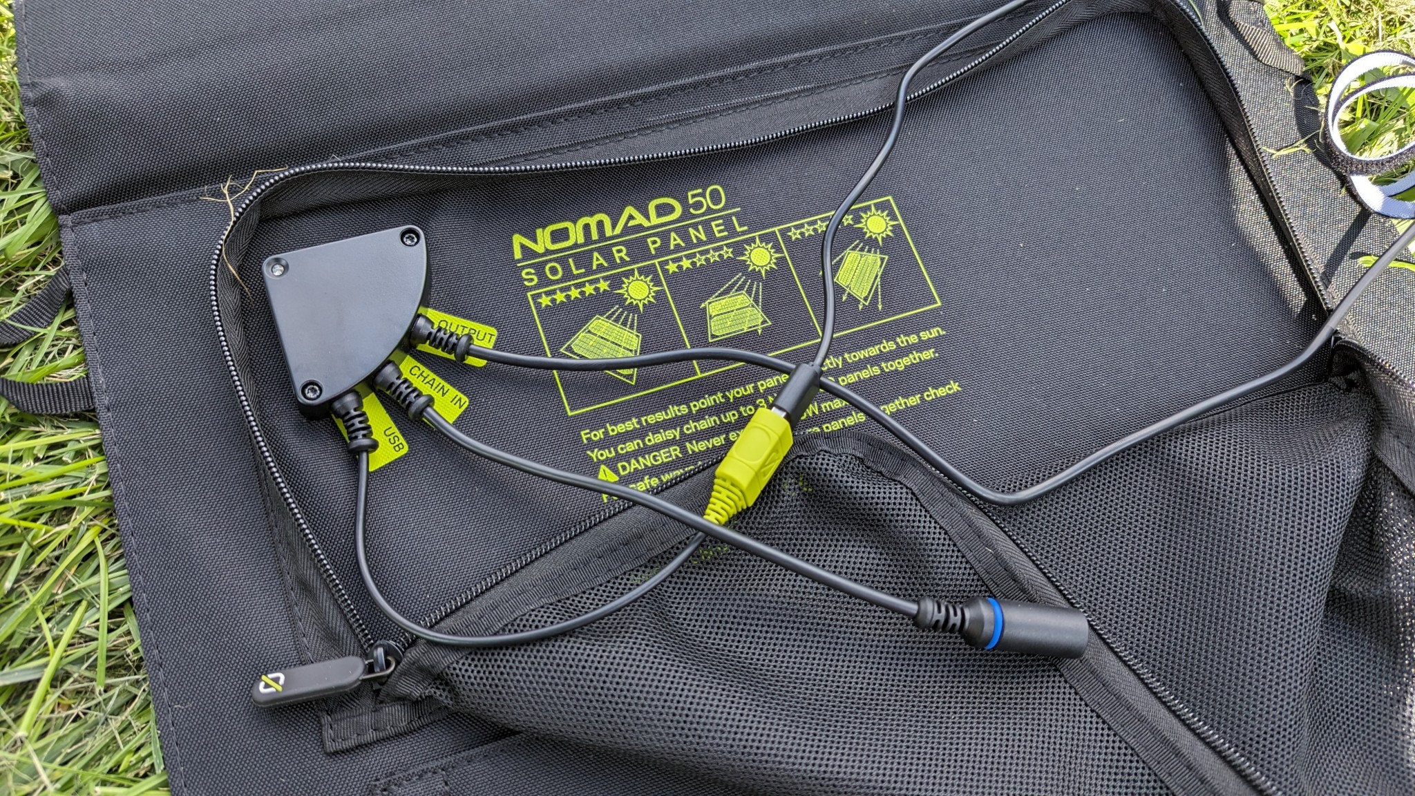 The Goal Zero Nomad 50 USB and DC outputs and is chainable with other solar panels, so you can double your power. Credit: Sam Schild