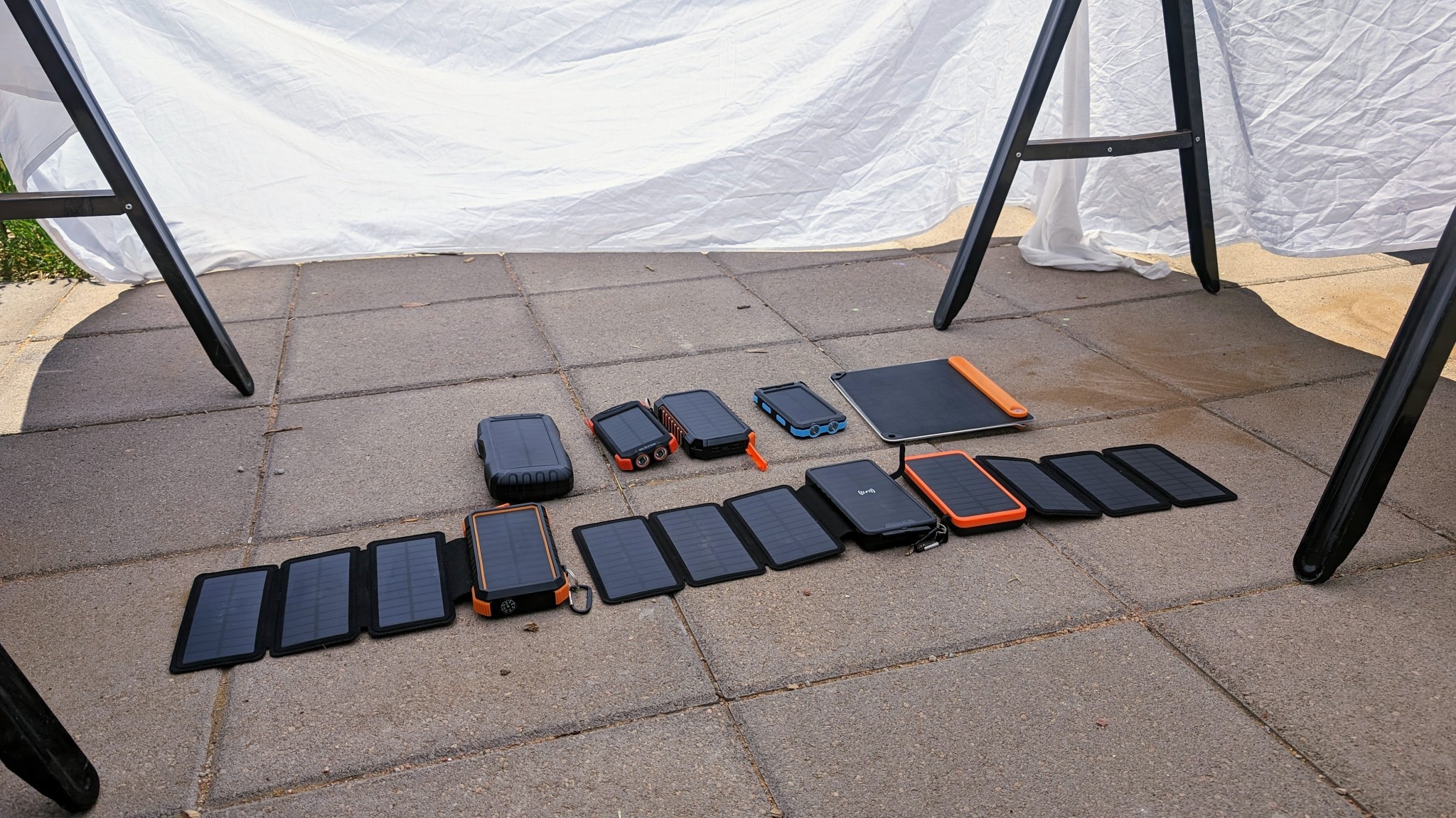 We used identical 10,000 mAh battery banks with each panel, set up in the same place at the same time, to measure direct solar charging speed. Credit: Sam Schild