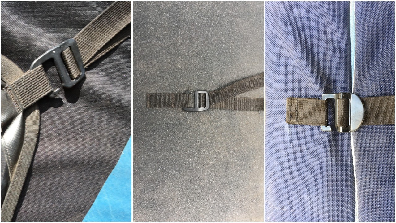 The Black Diamond Drop Zone (left) and Mondo's (center) buckles work well. Our testers preferred the Organic Simple's buckle (right) because of the smooth and easy action. Credit: Henry Feder