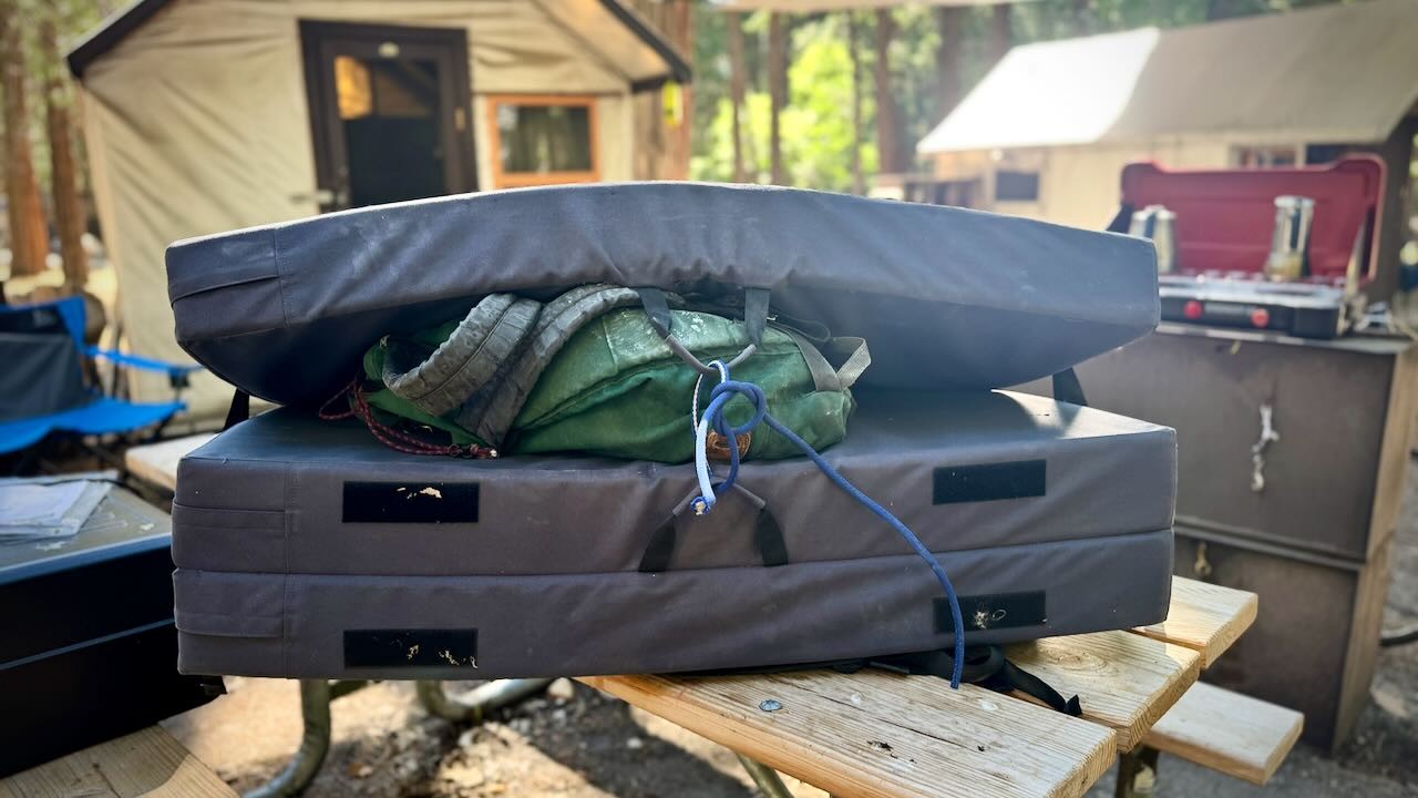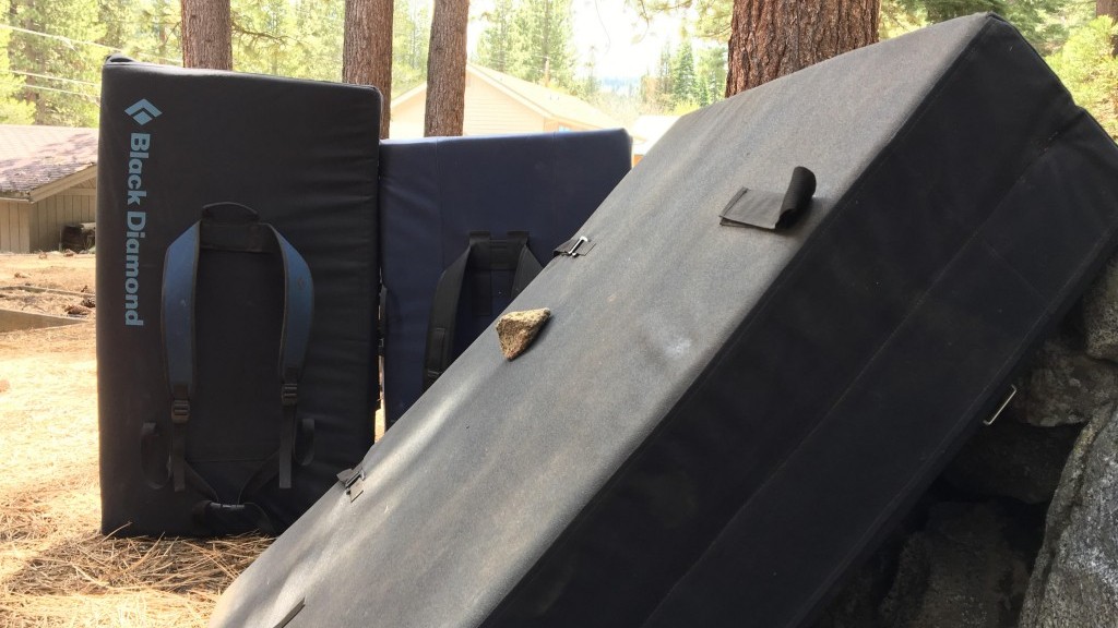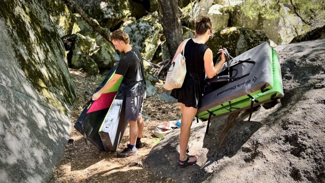 For taller problems, you and your friends may need to drag an arsenal of pads to the boulders. Some models have straps for carrying multiple pads at once. Credit: Matt Bento