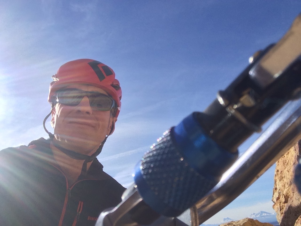 Using the super light and compact Pure Slider as an anchor attachment on a multi-pitch bolted climb at Smith Rock. It clearly holds a hitch just fine, and here is shown also backed up with a personal anchor system daisy chain.