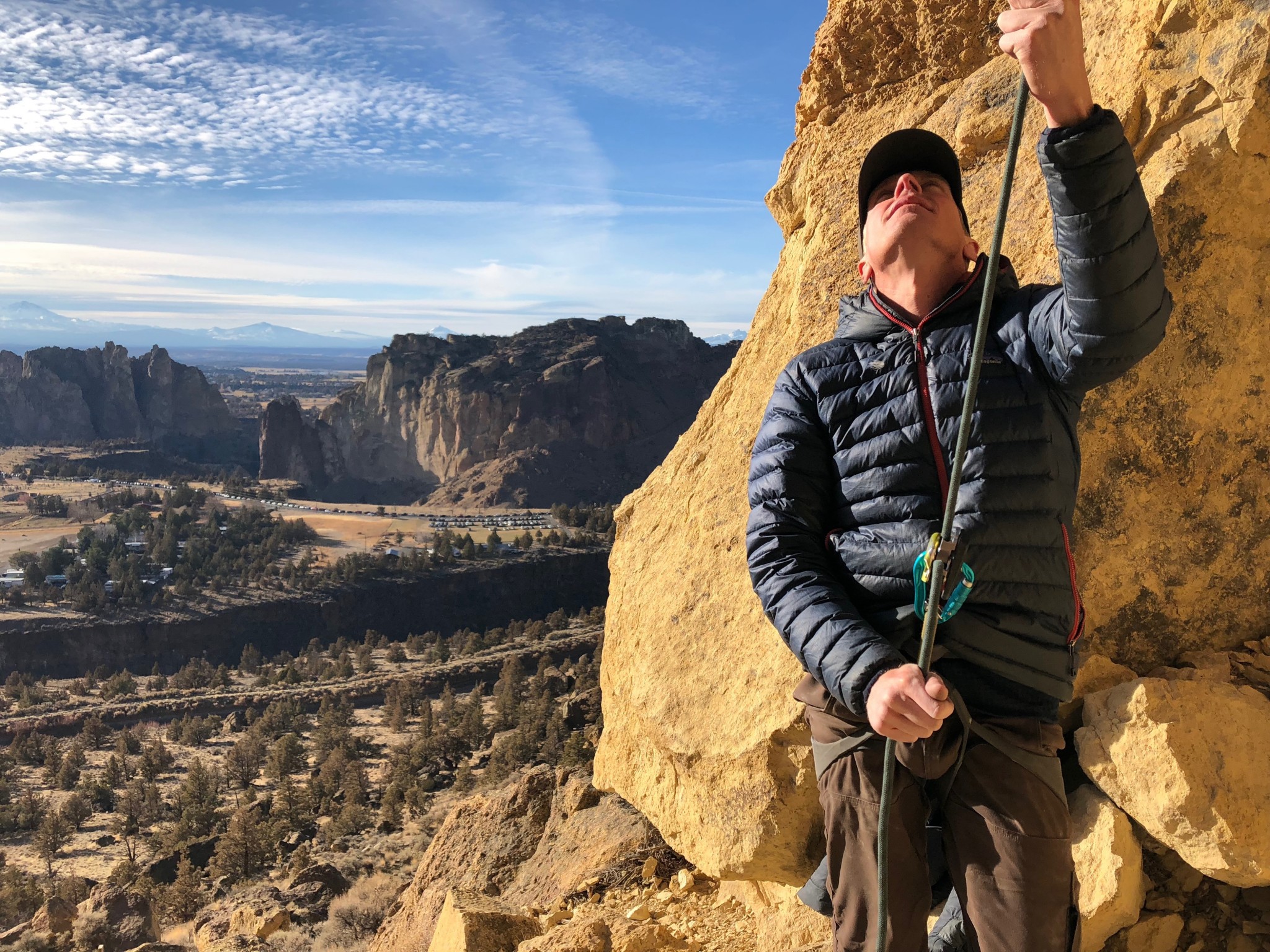 Doesn't get much nicer than topping out just before dark, here testing lockers on a quick late afternoon jaunt up the classic three pitch Zebra Zion at Smith Rock.