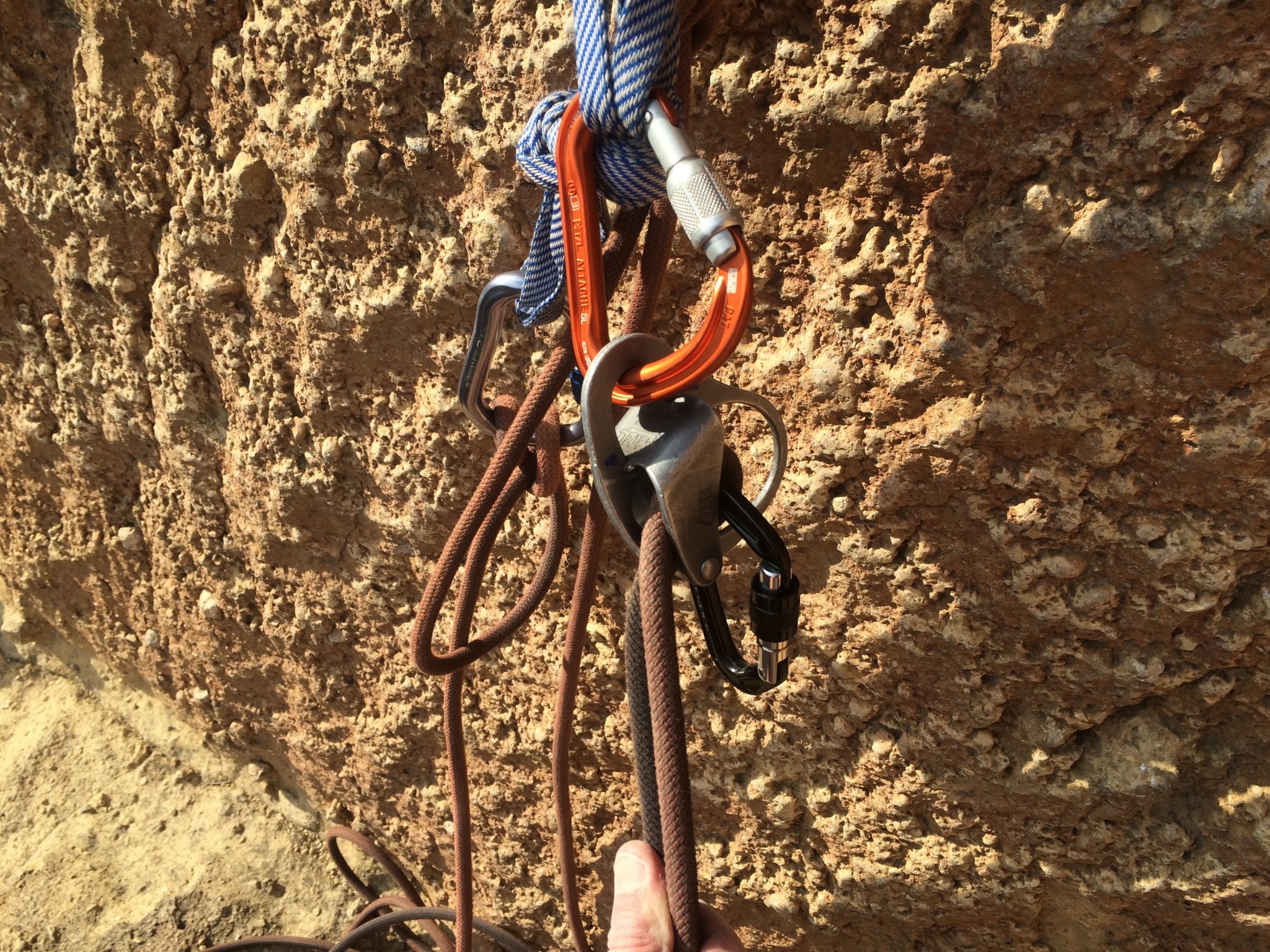 Because it is auto-locking, meaning you cannot forget to lock the gate, it makes for a great anchor attachment point, as we are using it here on the anchor of pitch 4 to secure ourselves with a clove hitch.