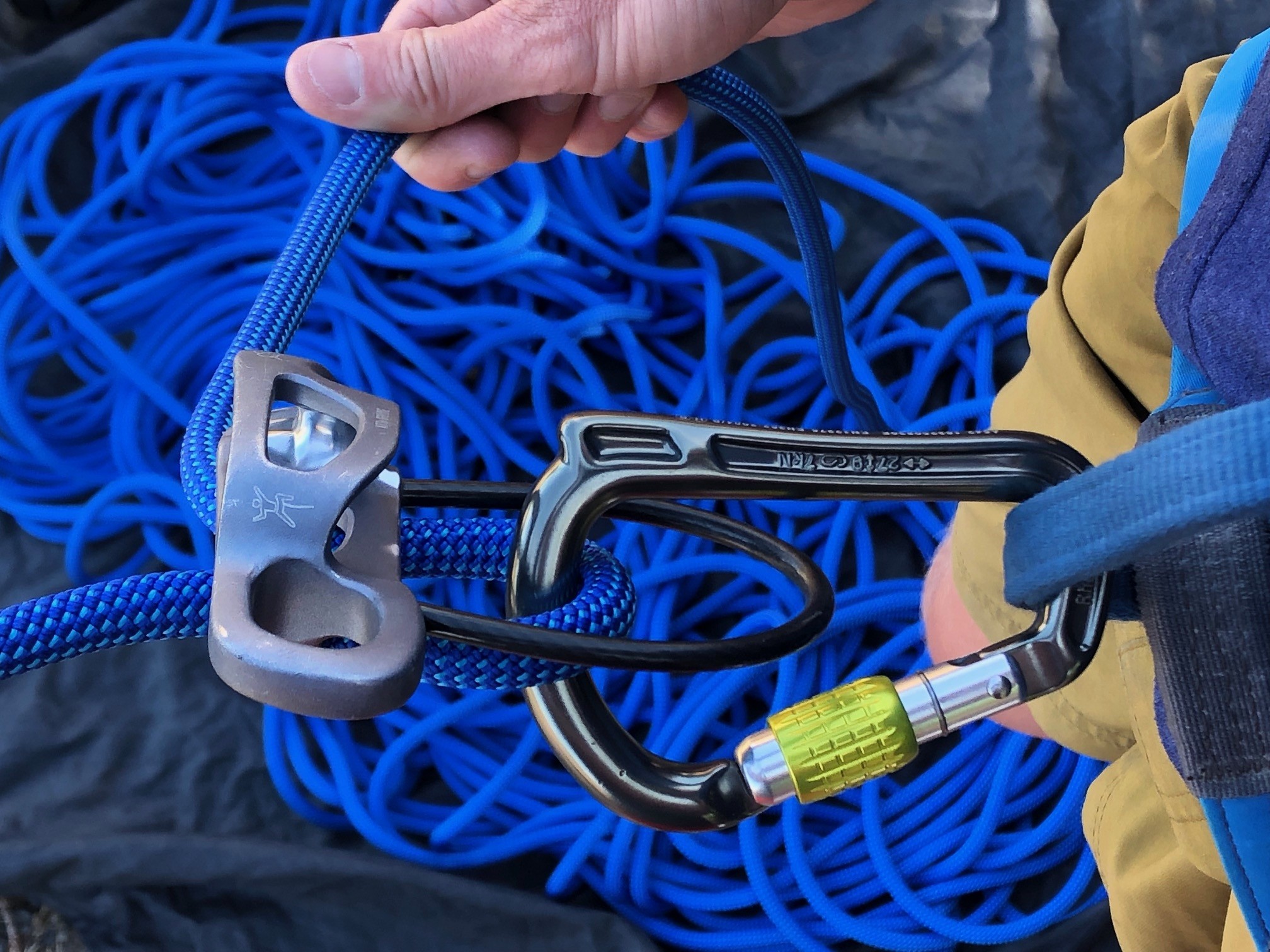Using a tiny and compact locker, like the black Super Tech shown here, as the second locker in an auto-block belay device, saves weight and space and works great. Using a locker with round stock in this situation will help the rope feed easier, but we prefer to carry less weight.