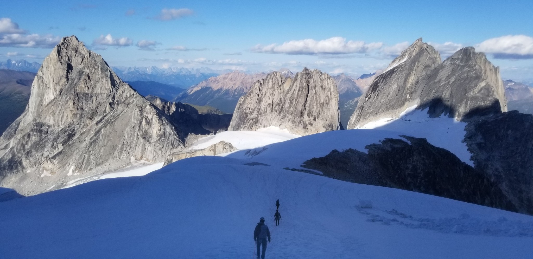Descending as a party of four on one rope while crossing glaciers in the Bugaboos. Tying in with multiple people in this way calls for locking carabiners, ideally used with alpine butterfly knots, and its best if each climber has an anti-crossloader for this usage.
