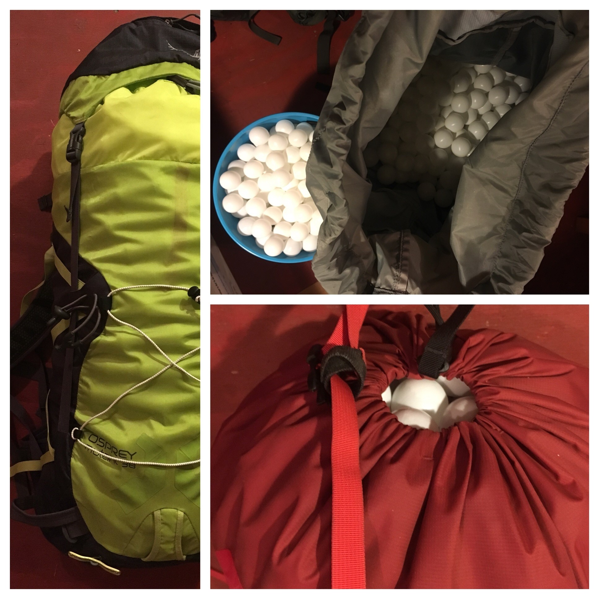 Our testing method is inspired by the standard but does not adhere to it exactly. For one, we used ping-pong balls, which are 40mm in diameter. They are easier to obtain, a more common object for our readers to recognize, and now we have enough balls to play ping-pong for the rest of our lives. Second, and more importantly, we filled the packs the way the climbing public might in real life, not in an arbitrary way.
