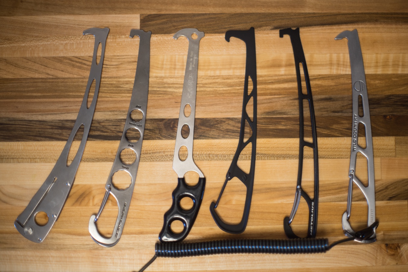 The Trango Shark and the Camp tool will need an additional carabiner to clip to your harness, while the other 4 in our selection have built-in clipping points. Credit: Matt Bento