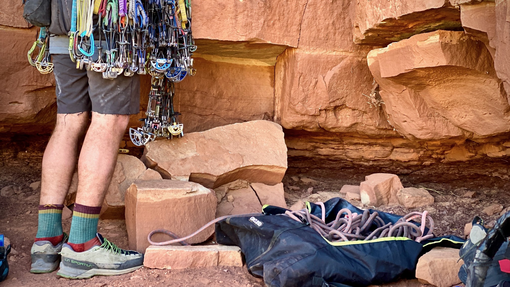 The tie-in loops on the Edelrid Drone do double duty as convenient carrying handles for transporting your rope between neighboring routes. Credit: Jack Cramer