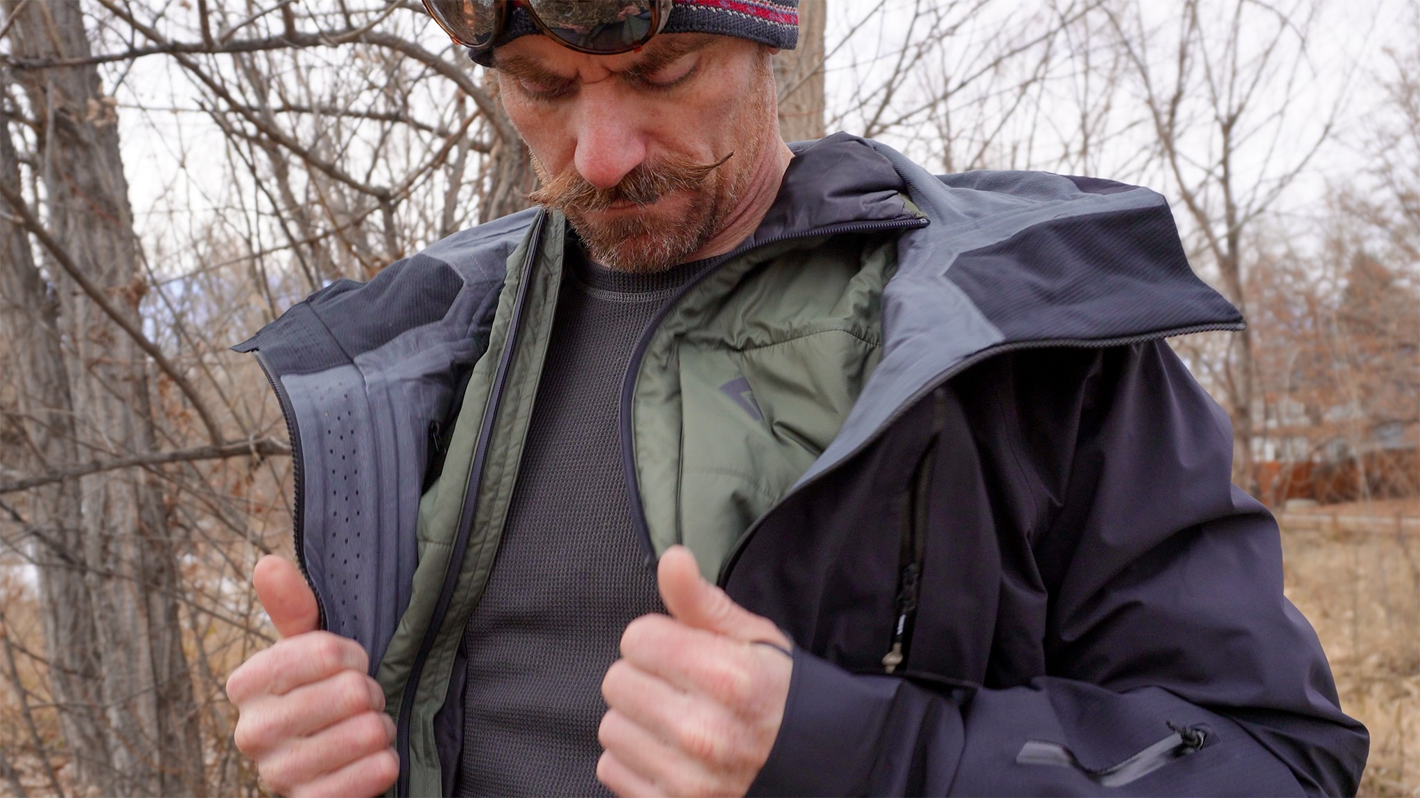 An example of a layering system, where a light, tight-fitting base layer is put on first, then the looser and thicker Smartwool Classic Thermal Merino 1/4 Zip is worn on top, with a heavy insulated down jacket as the outer layer. Credit: Justin Simoni