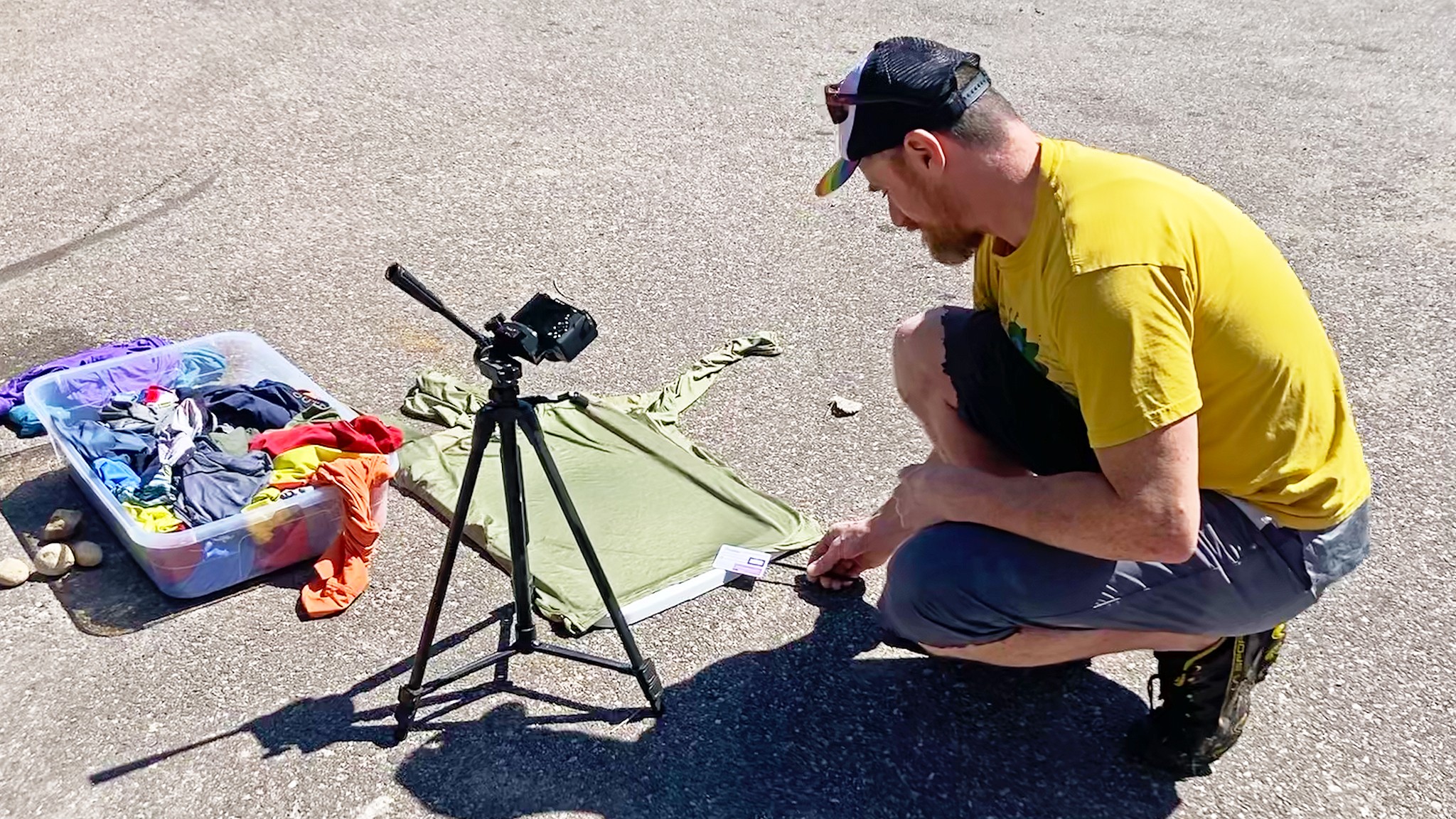 Dry time was tested by recording each sun shirt's dry weight, washing them all together, and hanging them up to dry. We'd take each shirt off at given intervals and weigh them to record the weight and time throughout the drying process. Then, we compared each shirt's dry time to metrics like dry weight, type of material, etc.