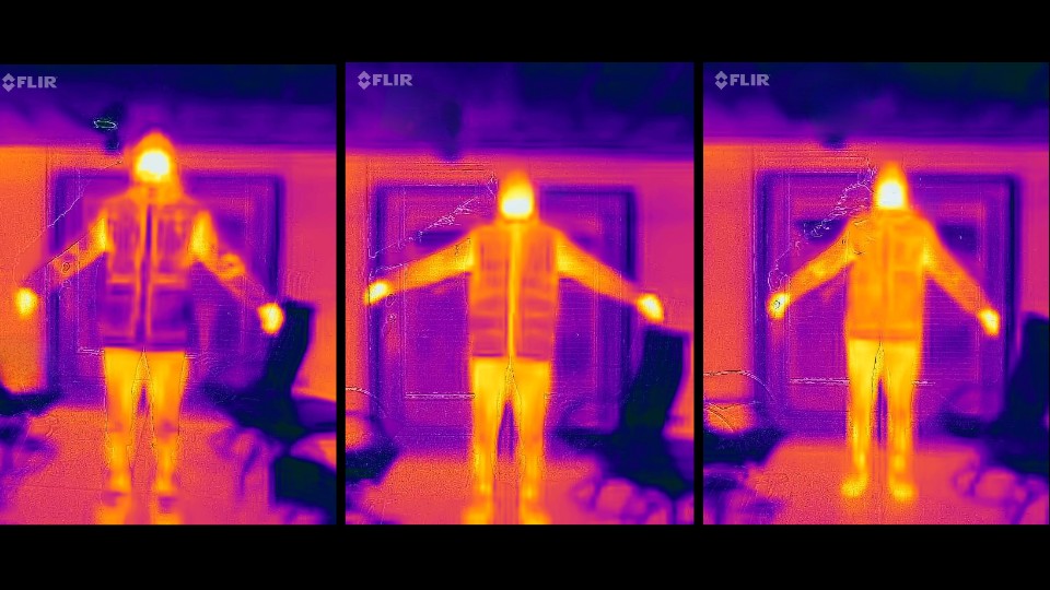 Warmth is the most important feature of any winter jacket. We conducted many of our side-by-side warmth tests on chilly winter nights, when temps were at their coldest, a task that not every type of jacket can handle. Our two flagship warmth tests were aimed at comparing each jacket side by side to see which could produce the greatest amount of warmth within a given time. First, we used a FLIR Thermal Imaging Camera to capture front and back images of each jacket. We did this on a cold January evening when temps were hovering at just above 20°F. The lighter colors in the images show the areas where heat is being lost the fastest, while darker colors denote the areas of each coat where heat is being retained.
