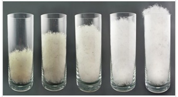 After harvesting down (typically from geese), it is cleaned, dried, and sorted according to quality. The down is blown across several tubes — the down that travels the farthest is the lightest, so it falls in the high-quality tube. The heavy down falls sooner and lands in the lower quality tube.