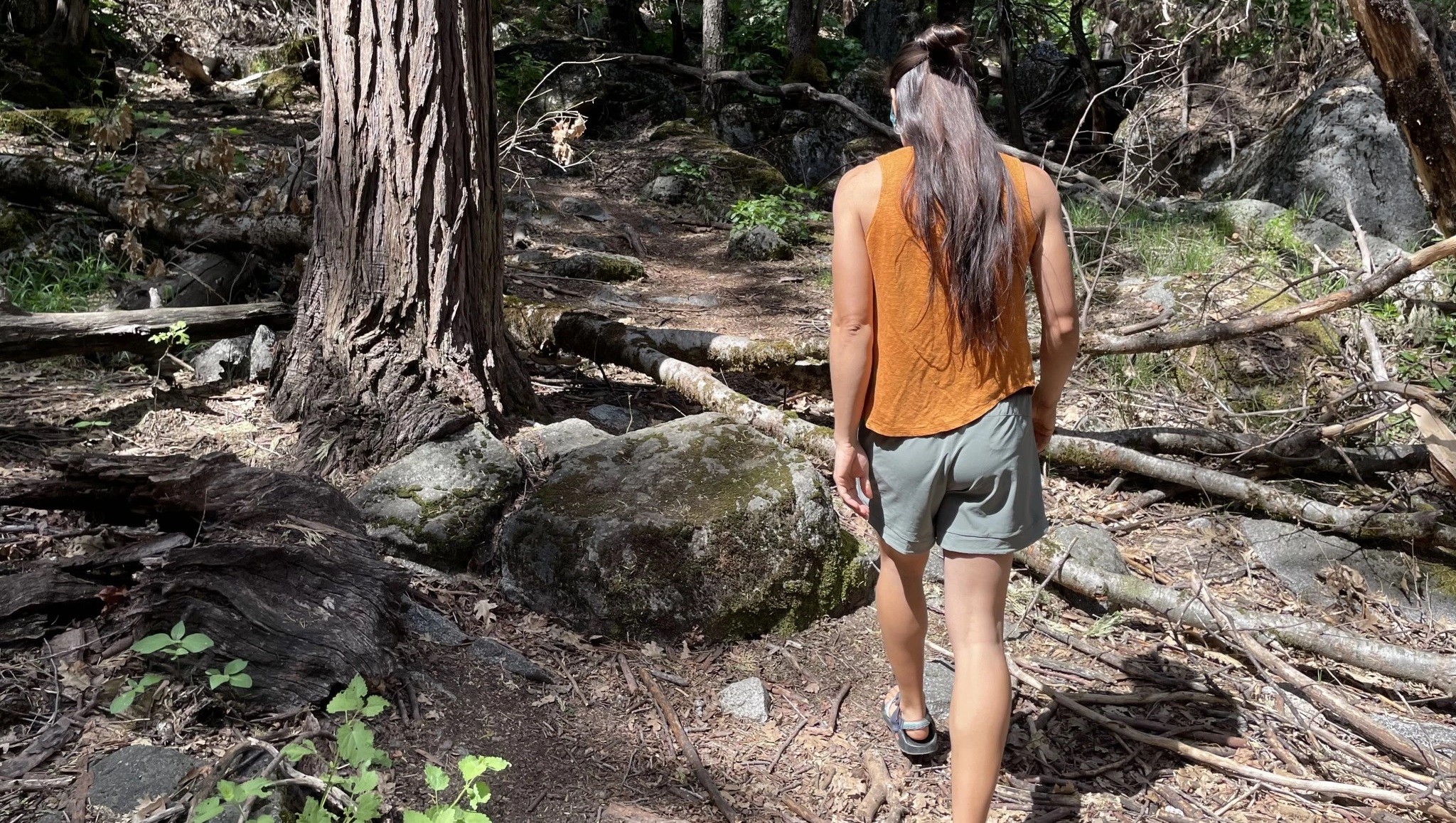 When examining fit, be sure to test your range of motion. Bringing your knees up toward the abdomen or performing a squat should be a fluid motion. The material should not dig into the thighs, butt, or hips. We understand this can be tricky to design for a broad potential audience since leg, hip, and waist ratios can differ for everyone. But, if you have to budge on flexibility, at least make sure you can sufficiently bring your knee toward your abdomen, ideally above a 90-degree angle, with relative ease. This will make all the difference on the trail when you start moving uphill, particularly if you're a hiker who loves steep and rocky terrain. If you're feeling spicy, try some yoga poses, crouch down, and scale a flight of stairs —- in essence, move around as much as possible to gauge how the shorts move with your body.