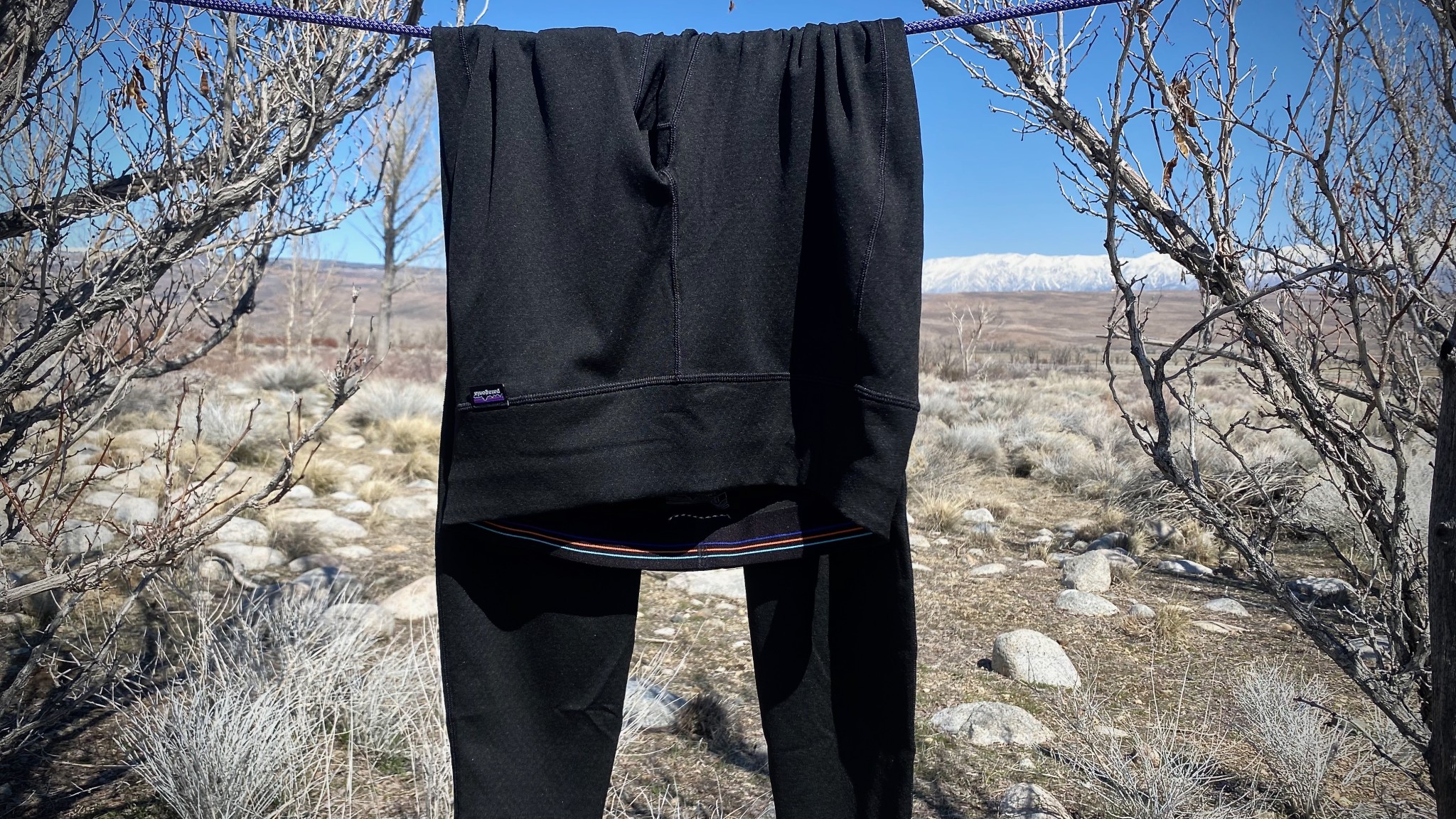 We soaked, wrung out, and hung each and every long underwear bottom on our climbing rope to objectively evaluate the drying speed side by side.   Credit: Trish Matheny