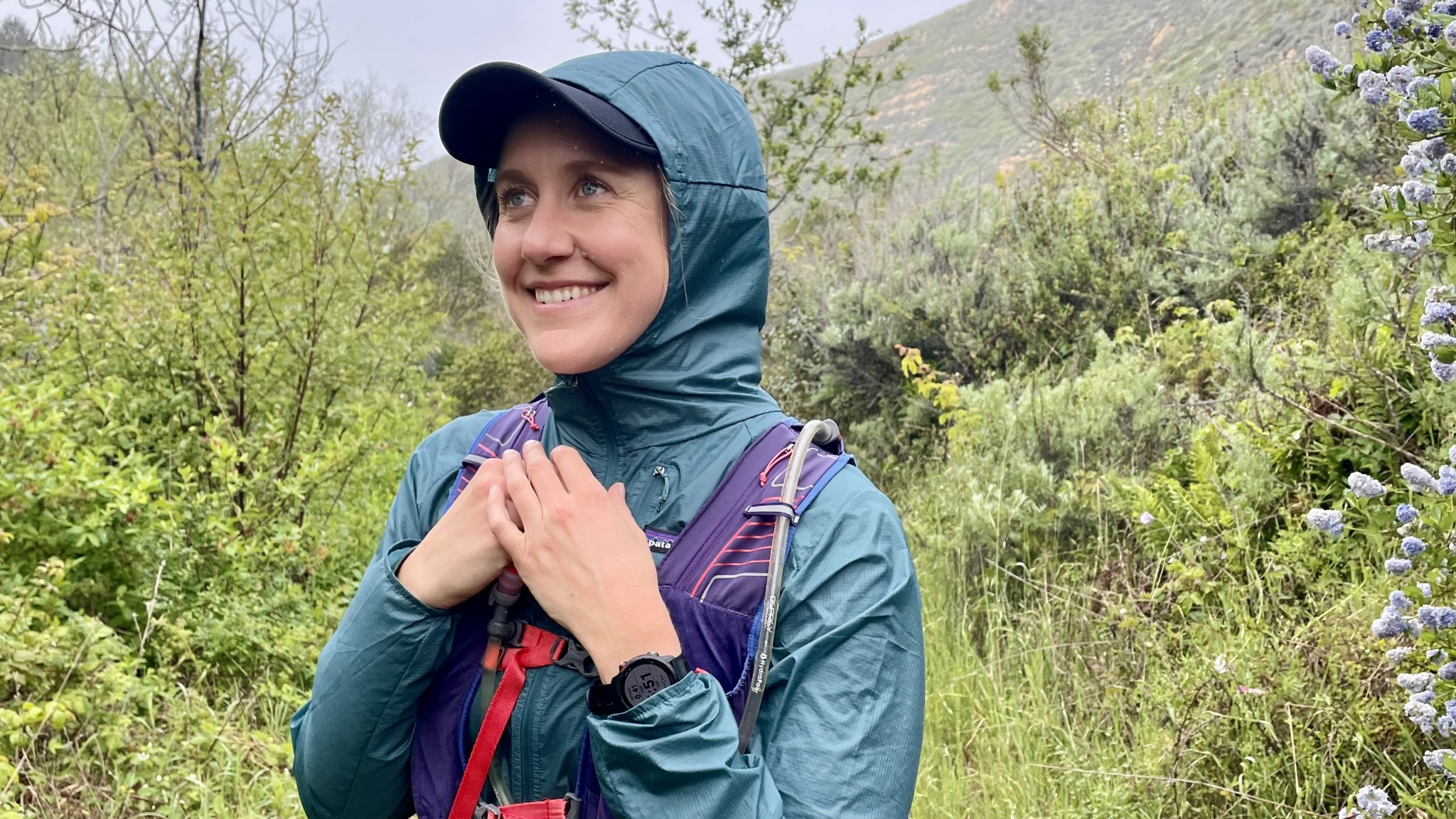 A few jackets elevate hood protection, like the Rab Vital, which pairs a scuba-style fit and soft elastic with a wire-stiffened brim for eye coverage, delivering impressive wind resistance despite its sheer fabric. Credit: Kat Thompson