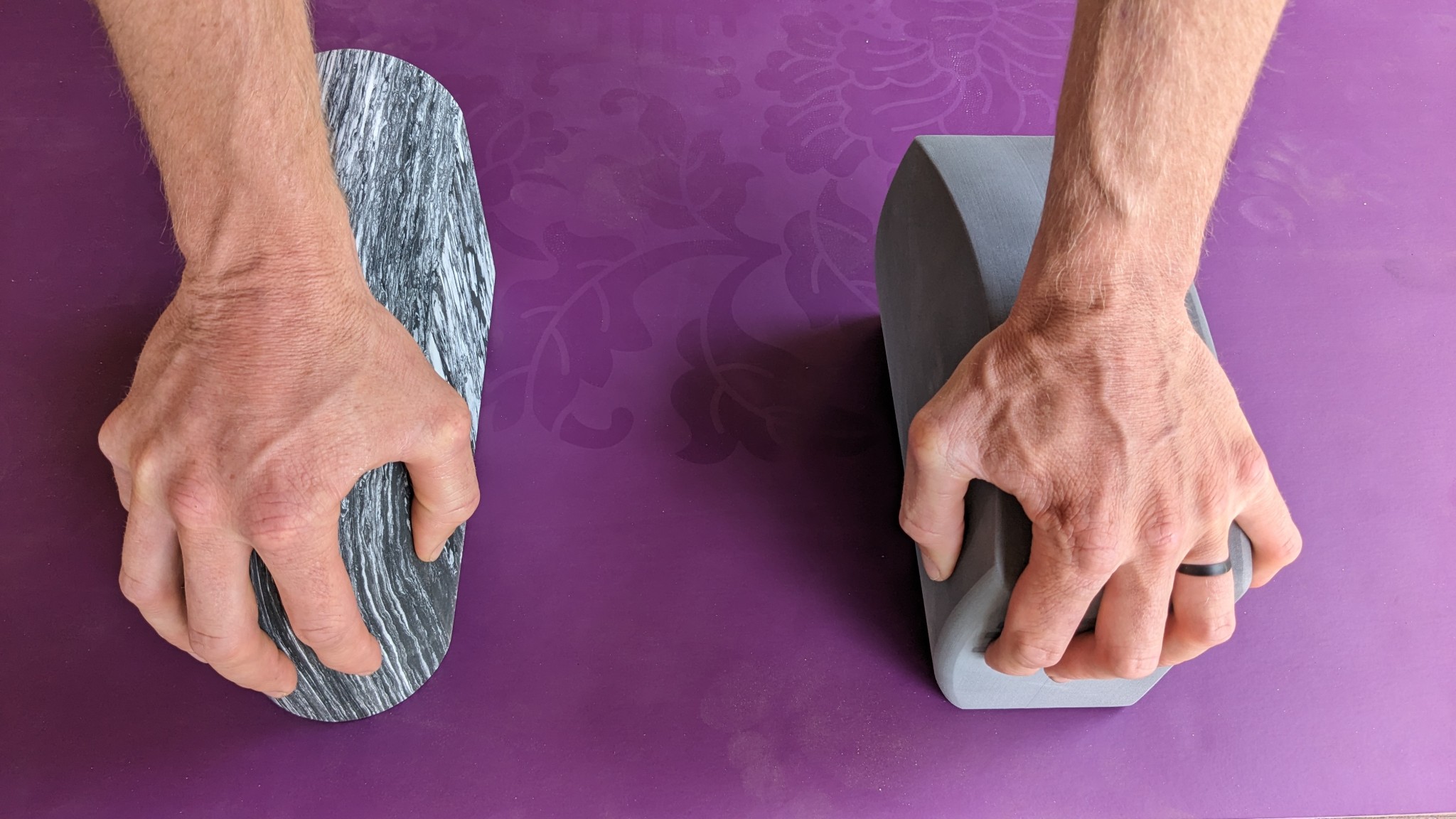 The rounded edge of the Lululemon is an excellent solution for pain in the hand as it allows the palm to cup the block. The curved edge of the unBLOK allows you to adjust the weight-bearing angle and reduce wrist pain. Credit: Kate Pitts
