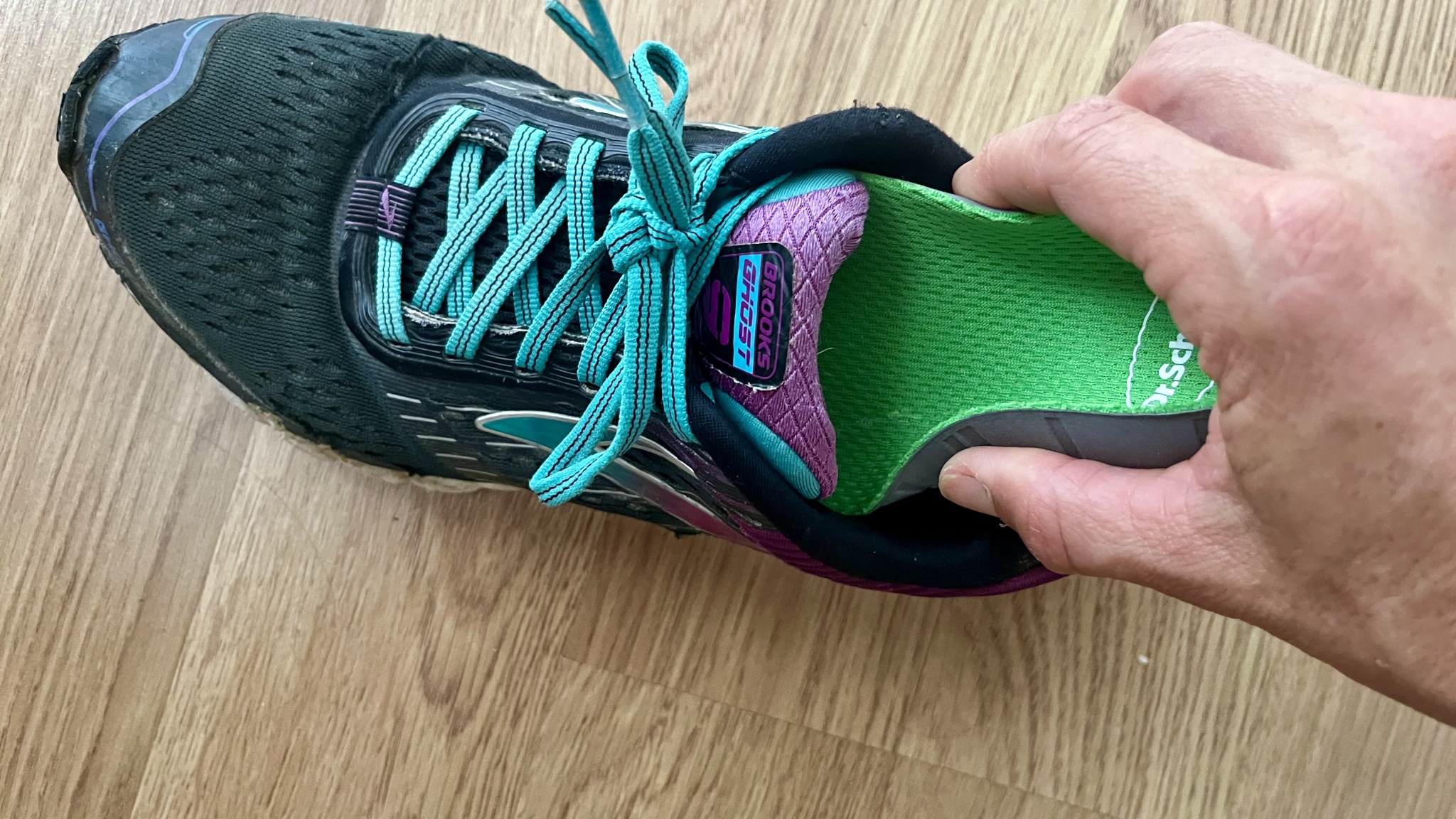 You need two hands to insert the Spenco Polysorb Cross Trainer since it's a soft and flexible insole. Credit: Whitney Clark