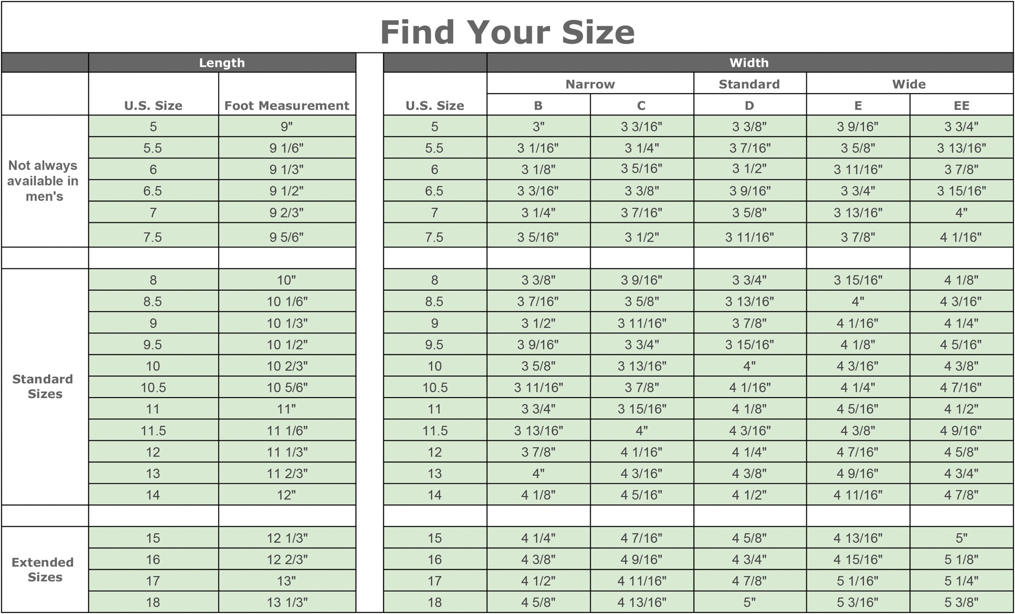 - 3) Find your length on the left of the chart, then track right to your width.