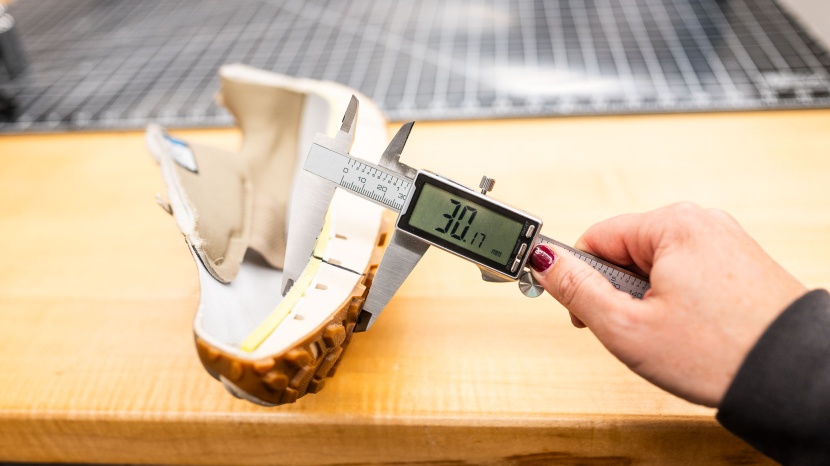 Our laboratory team of engineers cut open every pair to measure. In our testing facility, we take precise measurements of each shoe's key specifications according to the World Athletics guidelines. We record stack heights, heel-toe drops, and rocker angles using standardized methods to enable direct comparisons between models. We even cut shoes in half to verify internal construction and materials, allowing us to examine and document the various support structures and cushioning systems manufacturers employ.