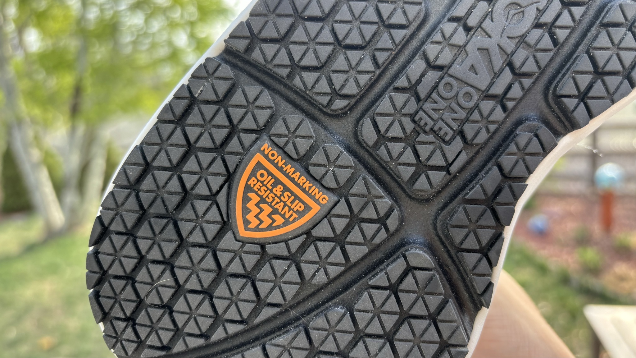 The Hoka Transport departs from Hoka's traditional ultra-plush trademark and offers “just enough” cushioning and a stable midsole for long shifts or outdoor walks. Our testers praised its stable, no-nonsense ride and sticky Vibram EcoStep Natural outsole (made with 90% oil-free ingredients), which works equally well on tile, gravel, and concrete. The lug pattern grips both slick floors and loose paths alike, while the quick-toggle laces cinch fast and release even faster. Mallory Paige, our lead tester, said, “I can quickly get these shoes on and off, which I appreciate for frequent trips in and out of the house.” Even after a full workday, our feet stayed fresh. We are happy to report no hot spots and no aching arches, just happy, comfortable feet.