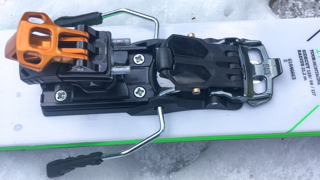 The Salomon/Atomic heel piece requires you to flip the bar labeled “ski” to hold the brakes off the snow. This can really only be accomplished with your hands. Credit: Jediah Porter