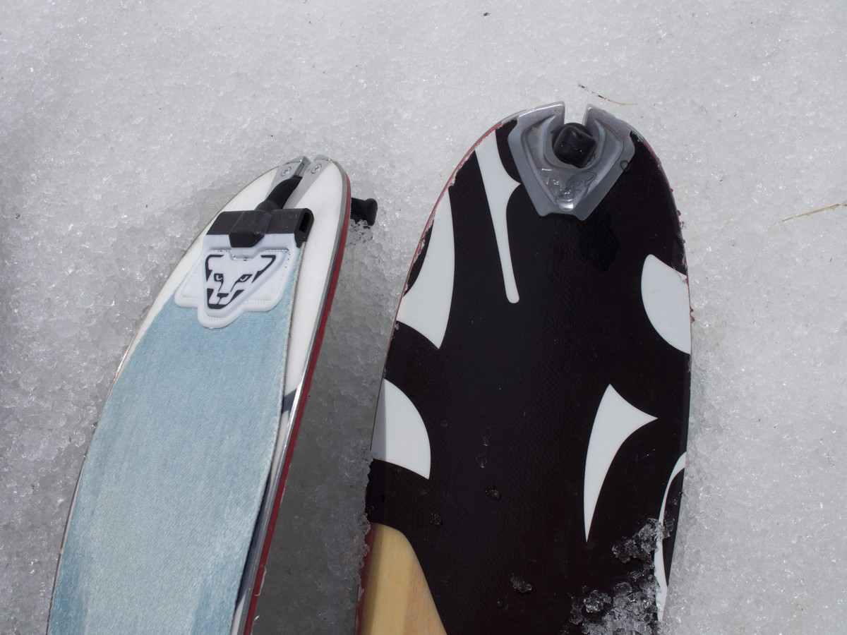 Compatibility is easily determined. Either skins are made to work with a specific model and size and tip/tail configuration, or they are “universal”. Specific model skins are less compatible. Among universal skins, we look for a range of available sizes, tip and tail attachments that work with all different ski shapes, and the ease of trimming and set up. When possible with the equipment we have, we try skin tip attachments on different ski tip shapes. Same with tail clips — thickness and roundness of ski tails inform skin compatibility.