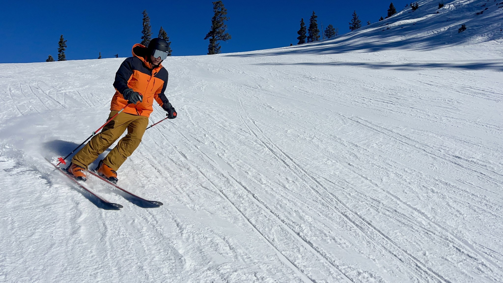 The lateral stiffness of the Tecnica Mach1 was particularly noticeable while carving groomers. Credit: Jeff Dobronyi