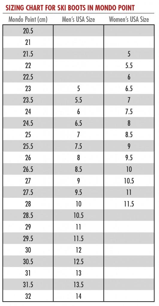 Ski boot sizing is measured using the Mondo Point System. Mondo point is the length of your foot in centimeters. If your foot is 24.5 centimeters long, then your mondo size is probably 24.5. Shops and boot fitters use a Brannock device to measure your feet accurately. If at home, you can also trace your foot on a piece of cardboard, keeping the pen vertical against your foot to leave a slight border. Then, measure the length from the heel to the longest part of your foot and round off to the nearest half centimeter. If you are an advanced to expert skier, you may want to size down for a performance fit. Most manufacturers make their boots available in half sizes like 27.5 and 28.5. If you fall between these sizes, remember that it is much easier to make your boot bigger than smaller - it is easy to make modifications to your liner to accommodate your foot, so rounding down is recommended.