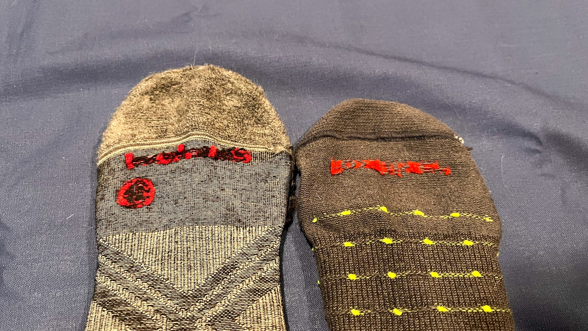 Two full cushion socks side by side: Smartwool (left) compared to the Eurosock (right). The Smartwool has a reduced profile despite its cushioned nature compared to the Eurosock. The Smartwool has more overall use yet has pilled less then Eurosock. Credit: Isaac Laredo